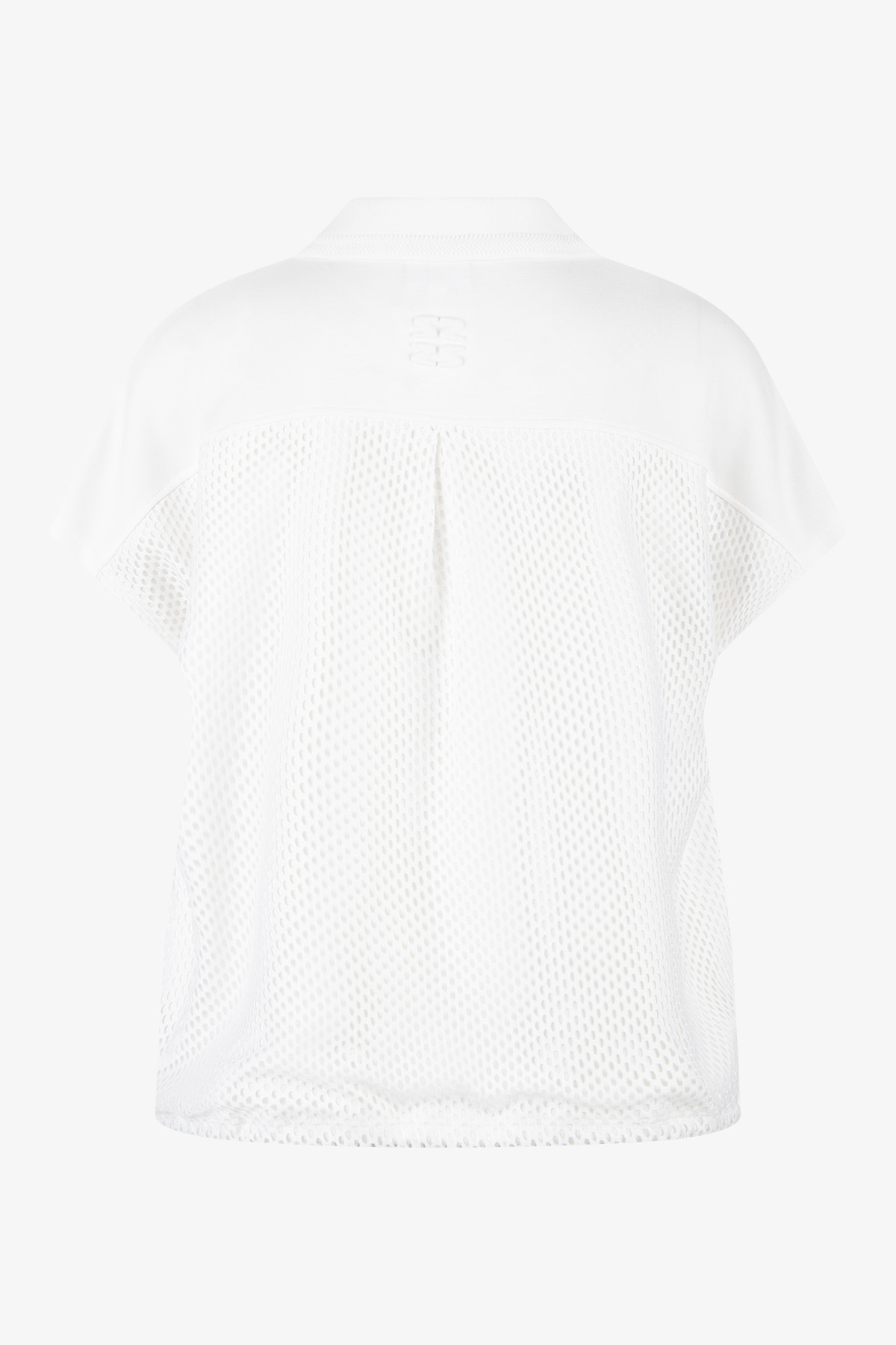 Модная женская рубашка поло впечатляет спортивной крупной сеткой на спинке. Свободный силуэт подчеркивает современный стиль.