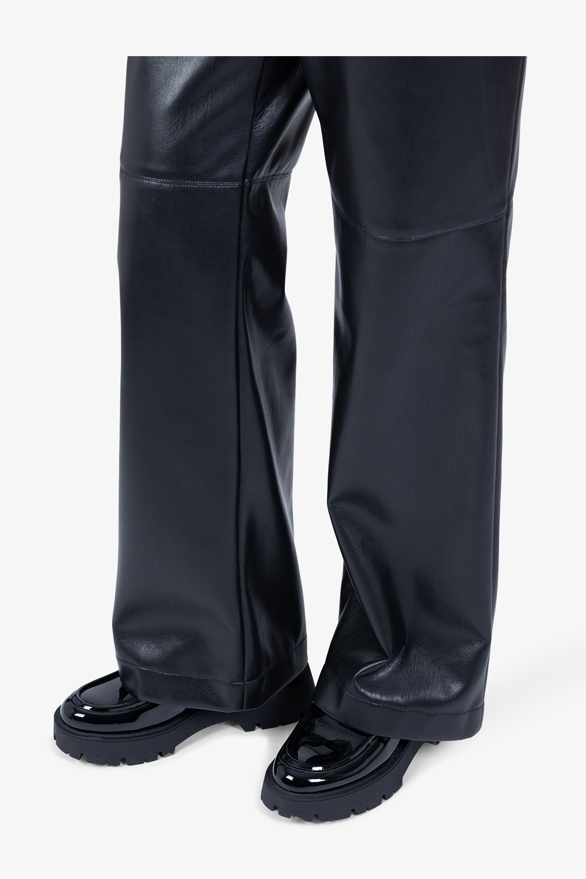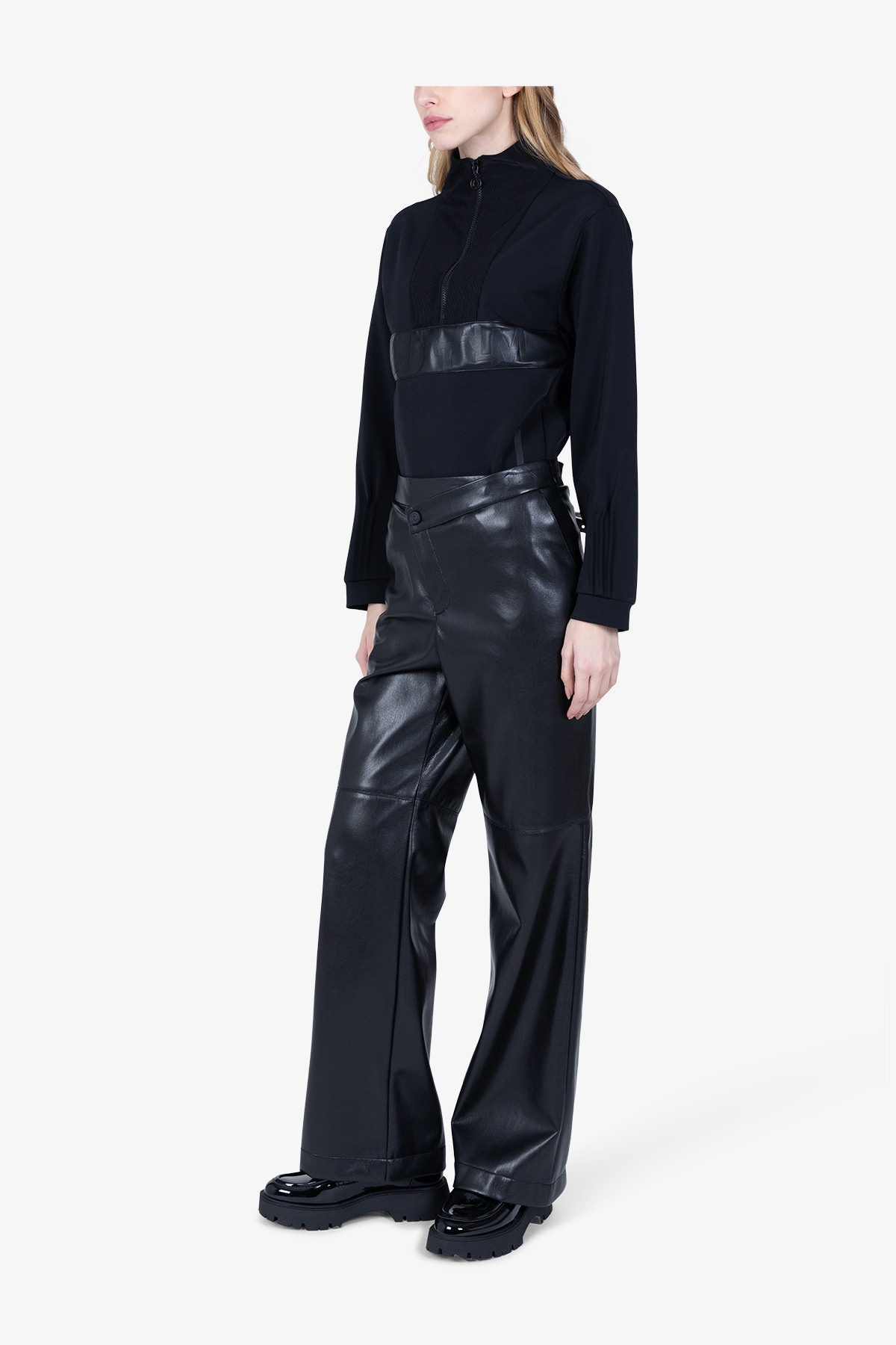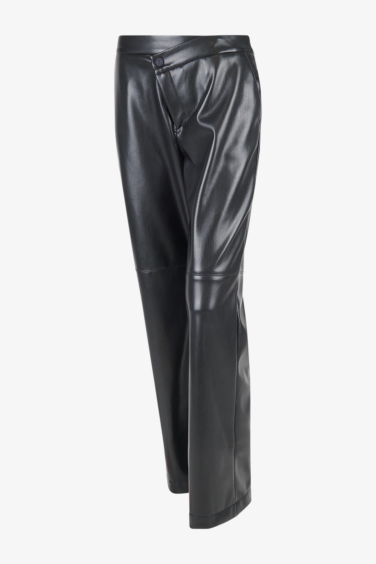 Брюки из искусственной кожи с экстравагантным асимметричным поясом для утонченного и модного вида. Этот дизайн сочетает вневременную элегантность с современным уникальным обликом.