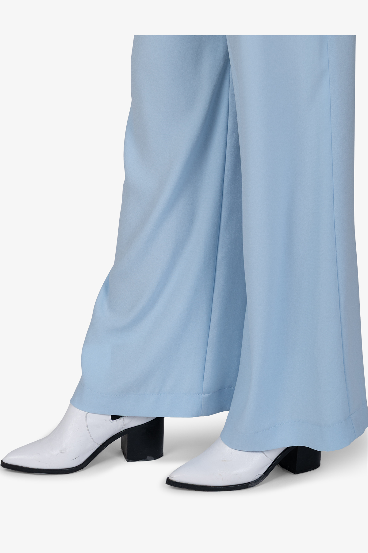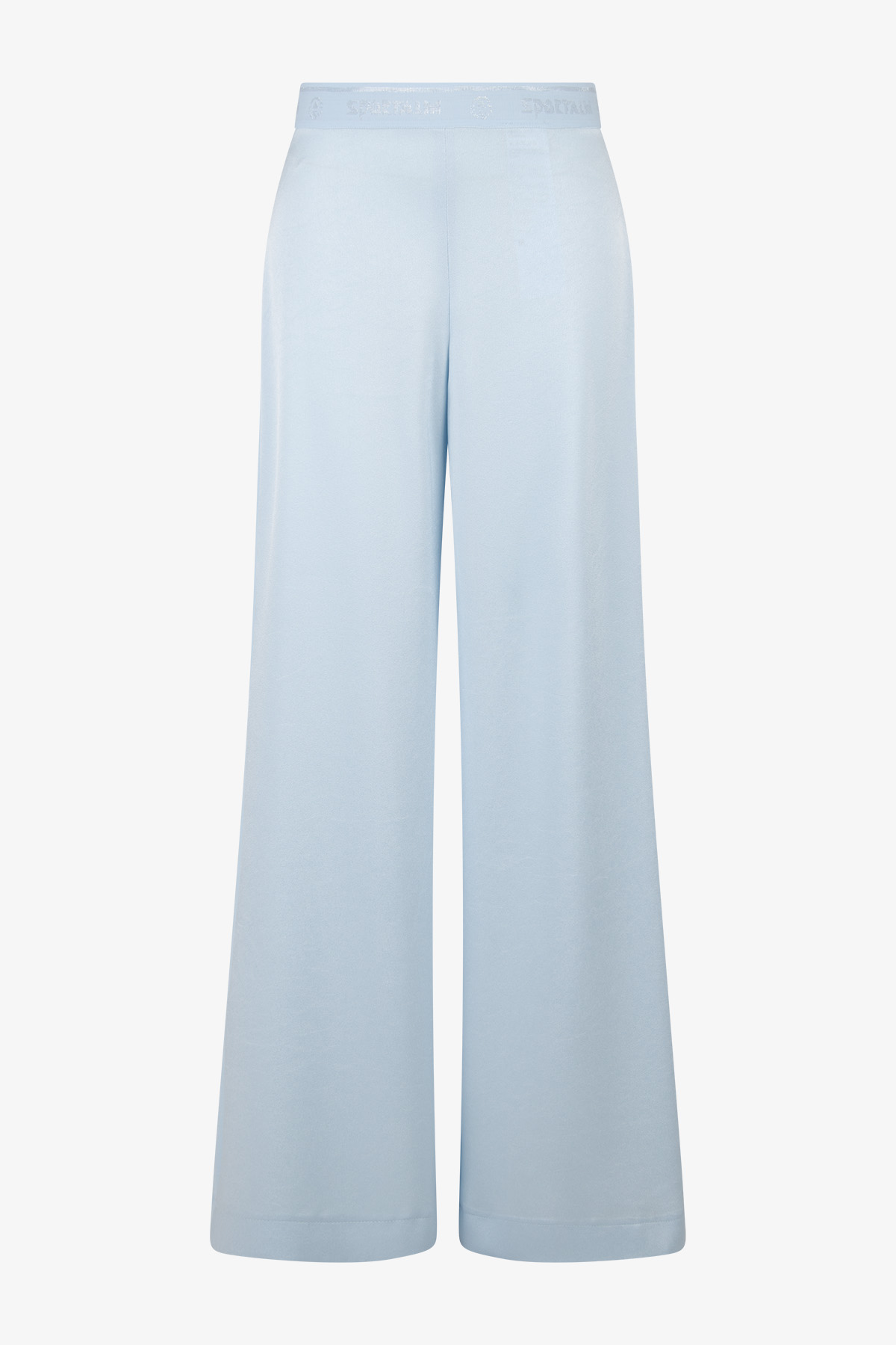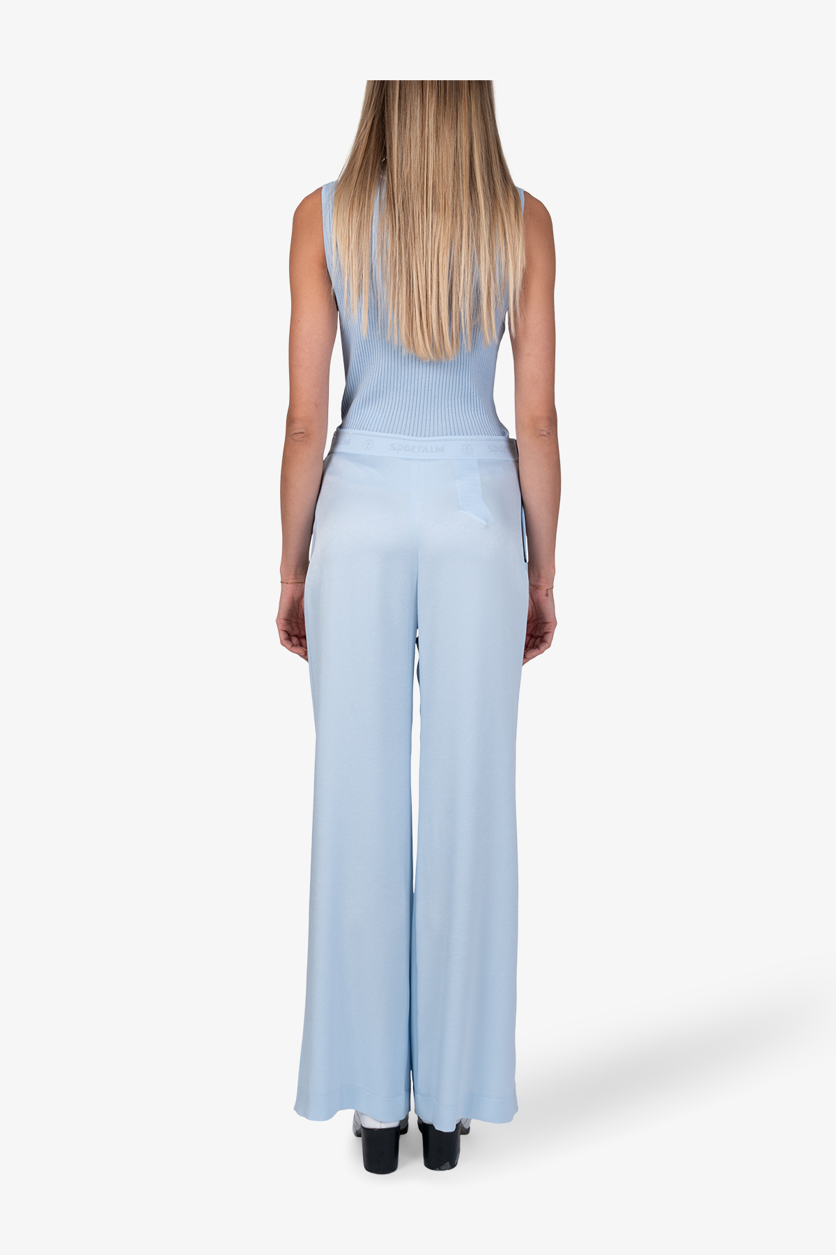 Струящиеся креповые брюки с расклешенными штанинами имеют мягкий блеск, матовые контрасты и легкие акценты из люрекса.