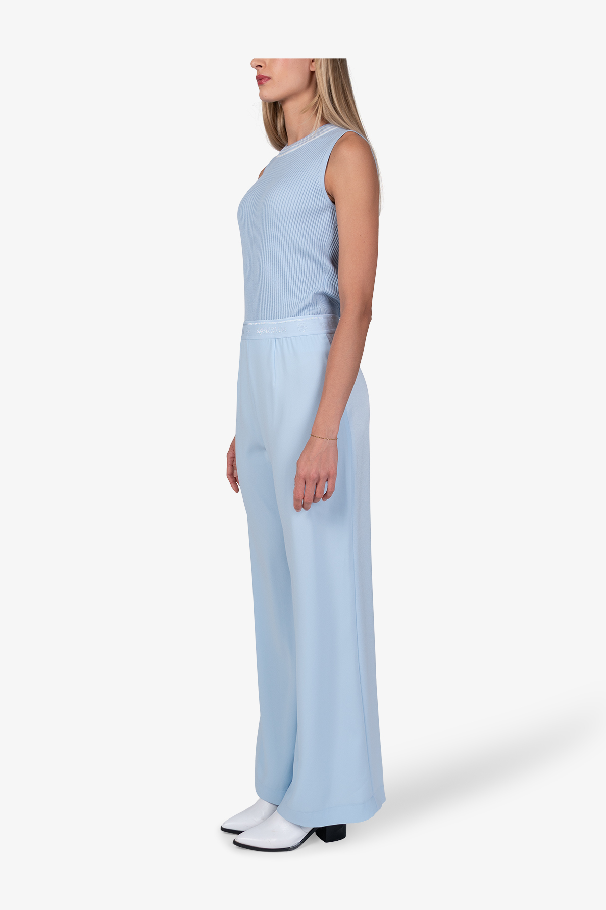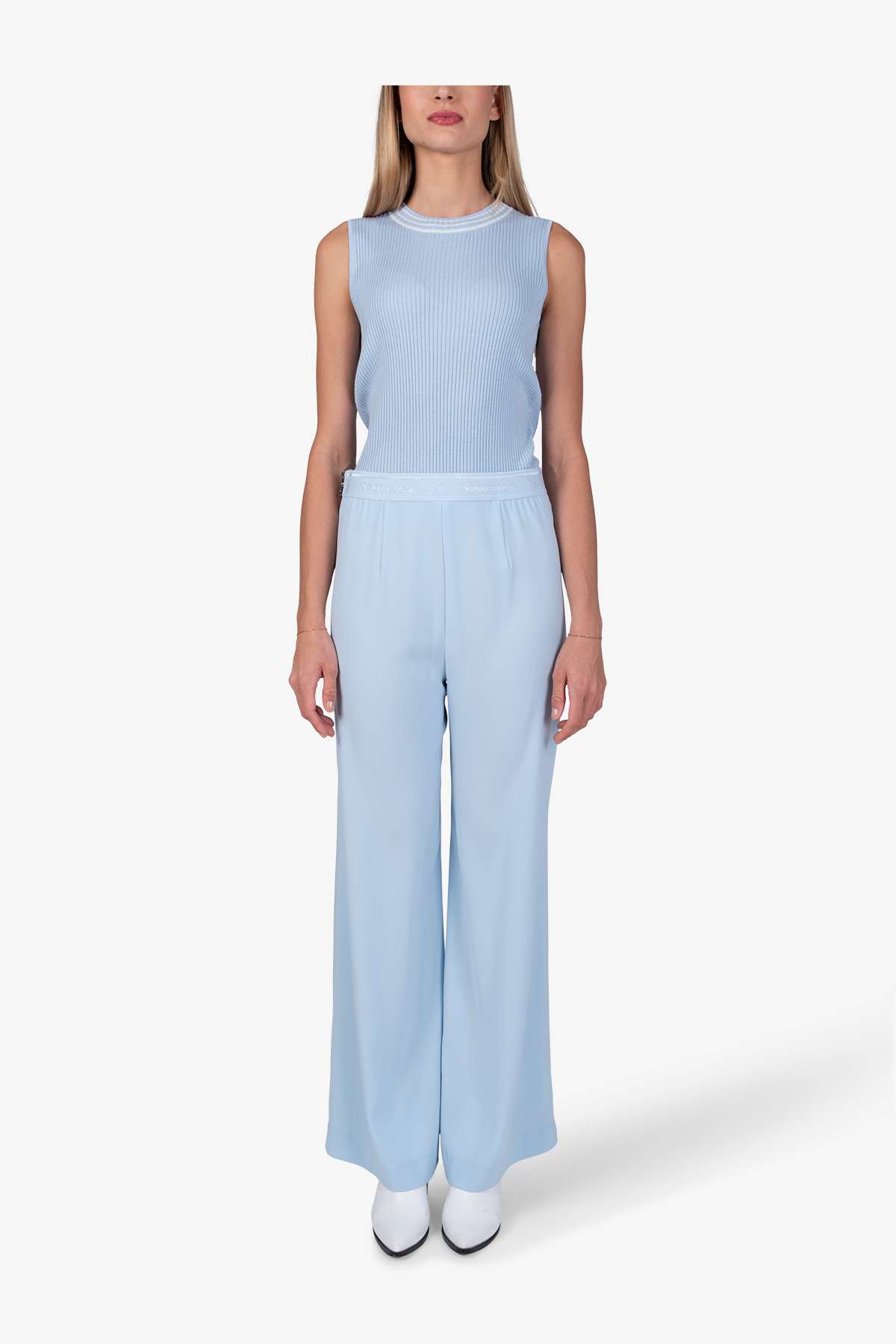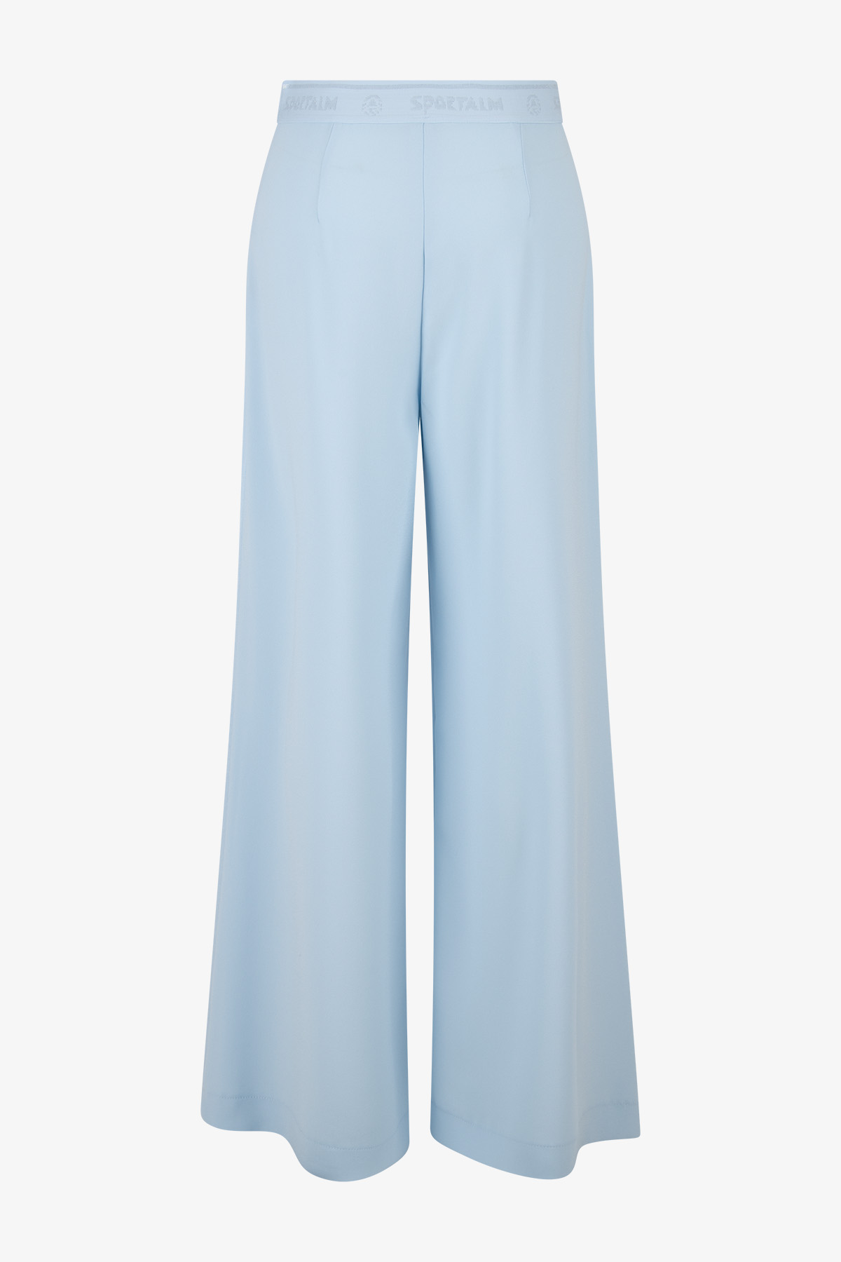Струящиеся креповые брюки с расклешенными штанинами имеют мягкий блеск, матовые контрасты и легкие акценты из люрекса.