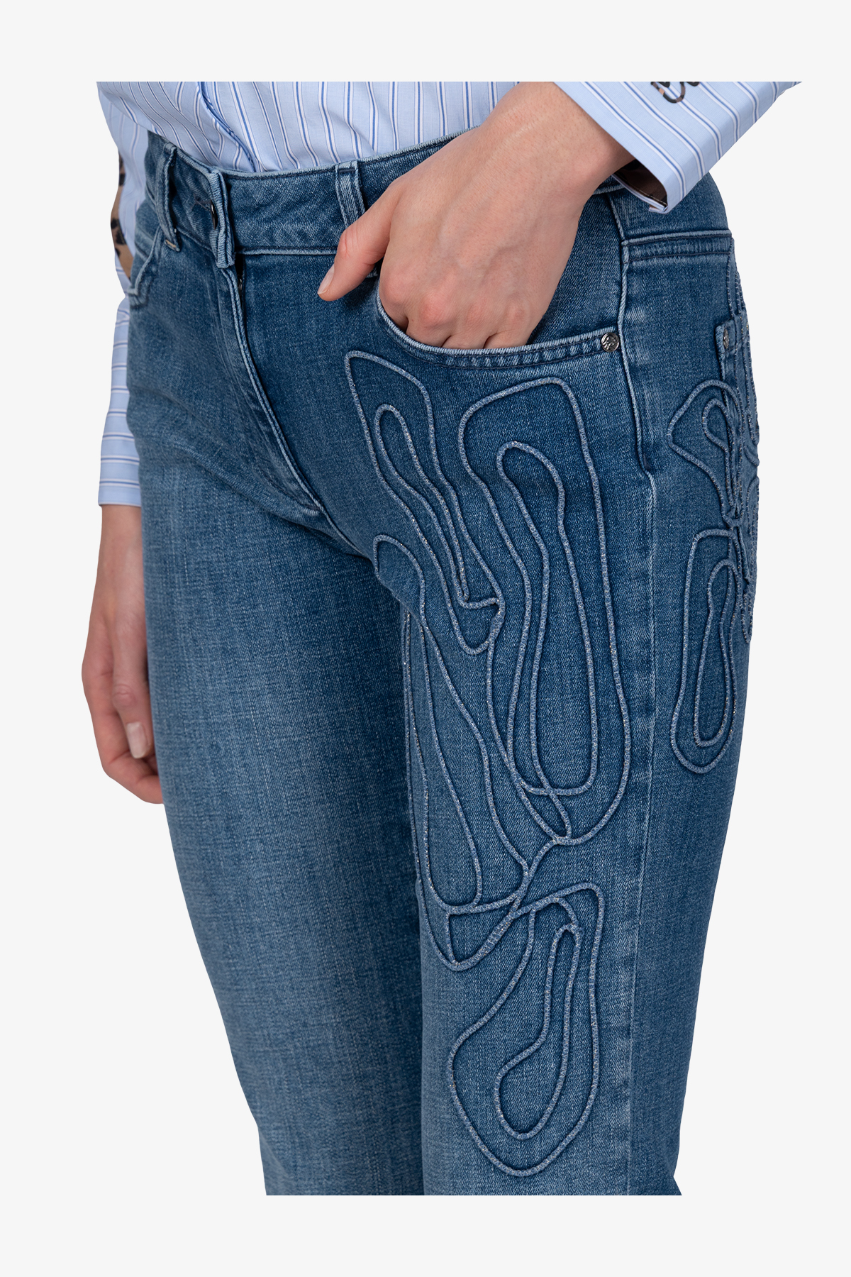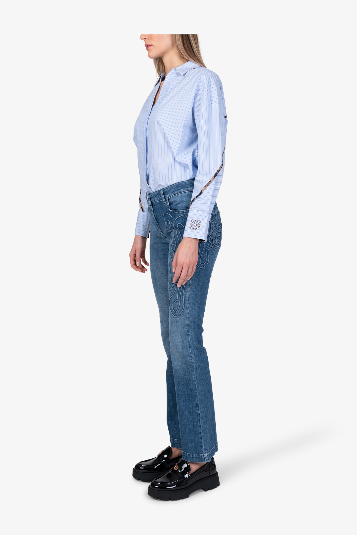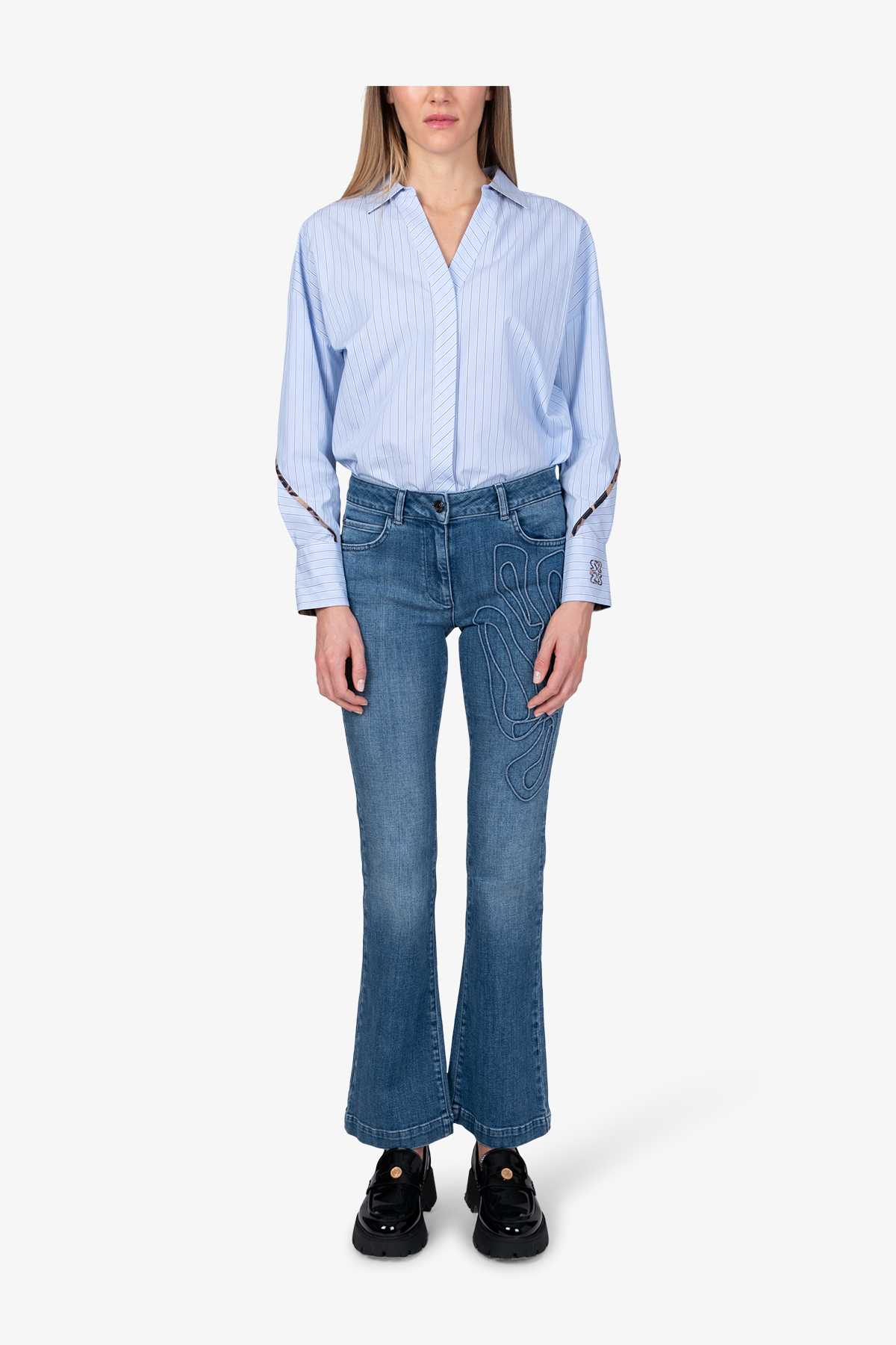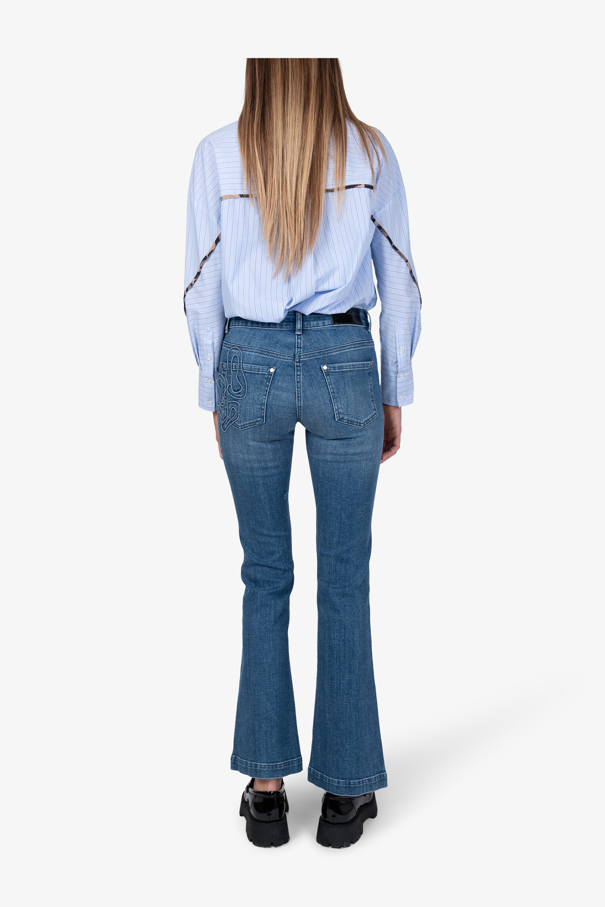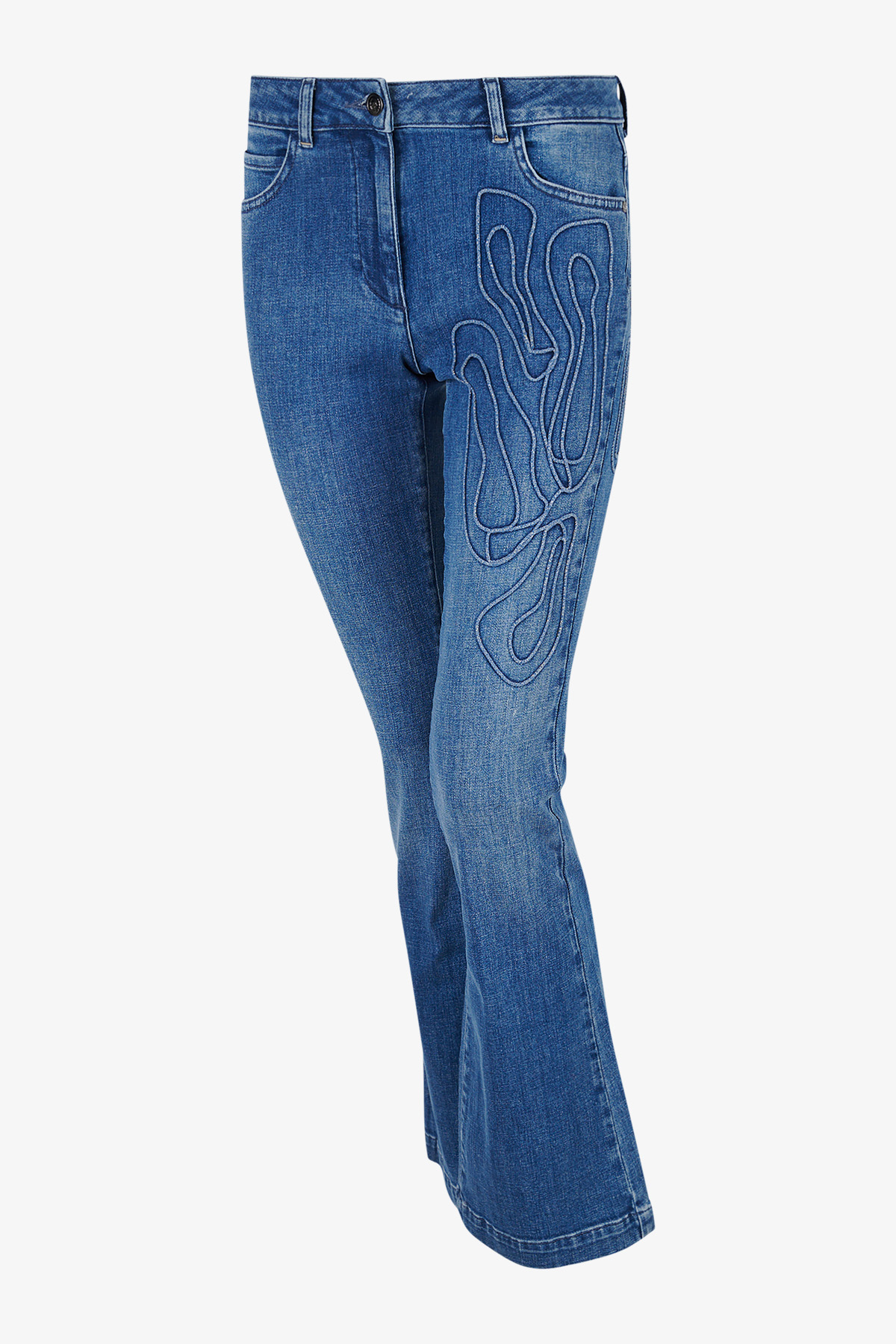 Стильные джинсы клеш с яркой 3D-аппликацией. Эта деталь придает джинсам уникальный современный вид.