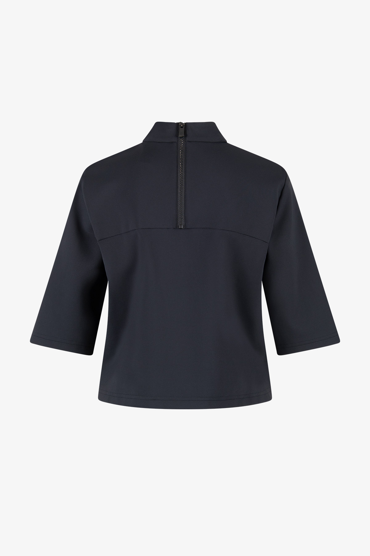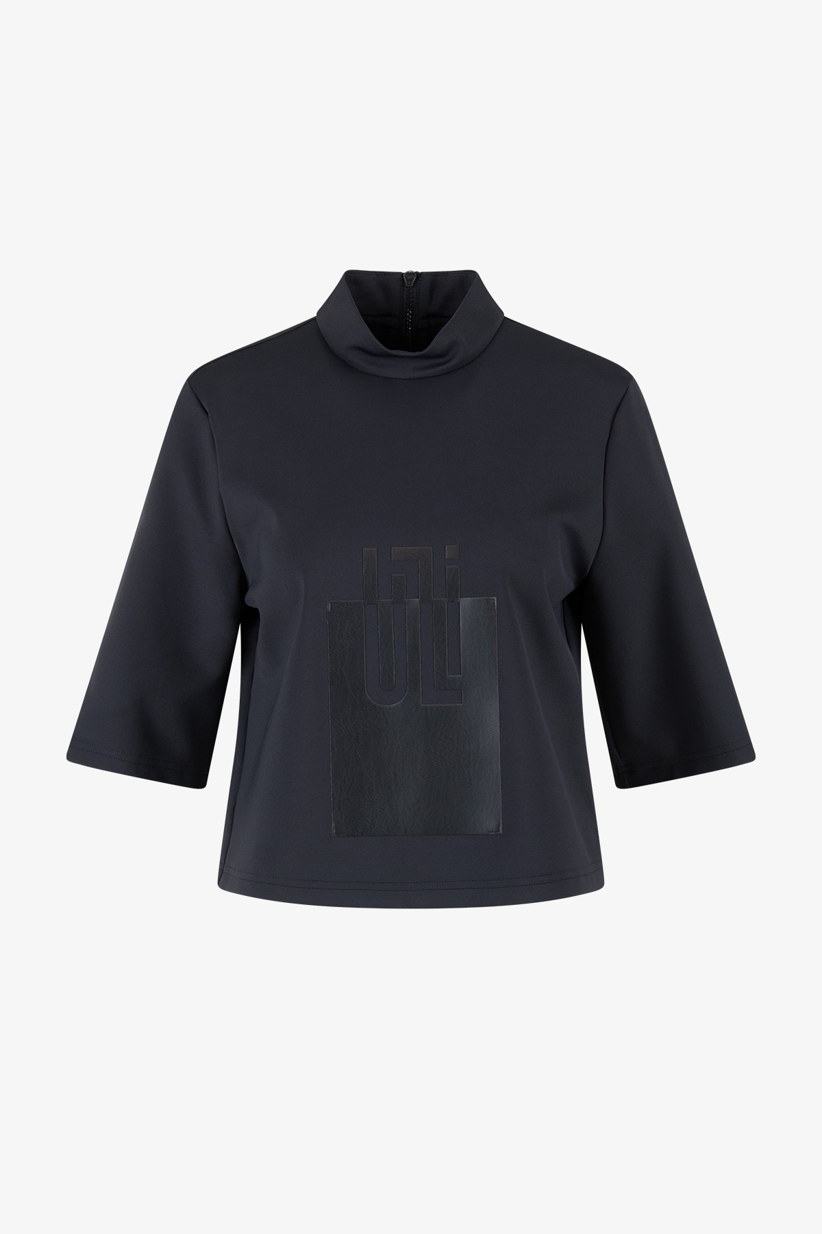 Повседневная футболка-бокси с современным воротником-стойкой и спортивной деталью на молнии сзади. Лазерный мотив ULLI из искусственной кожи добавляет особый акцент и превращает футболку в яркий, запоминающийся предмет гардероба.