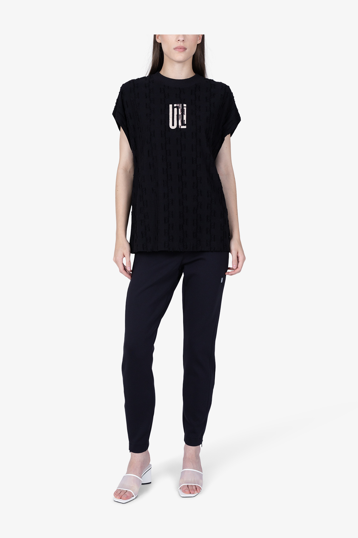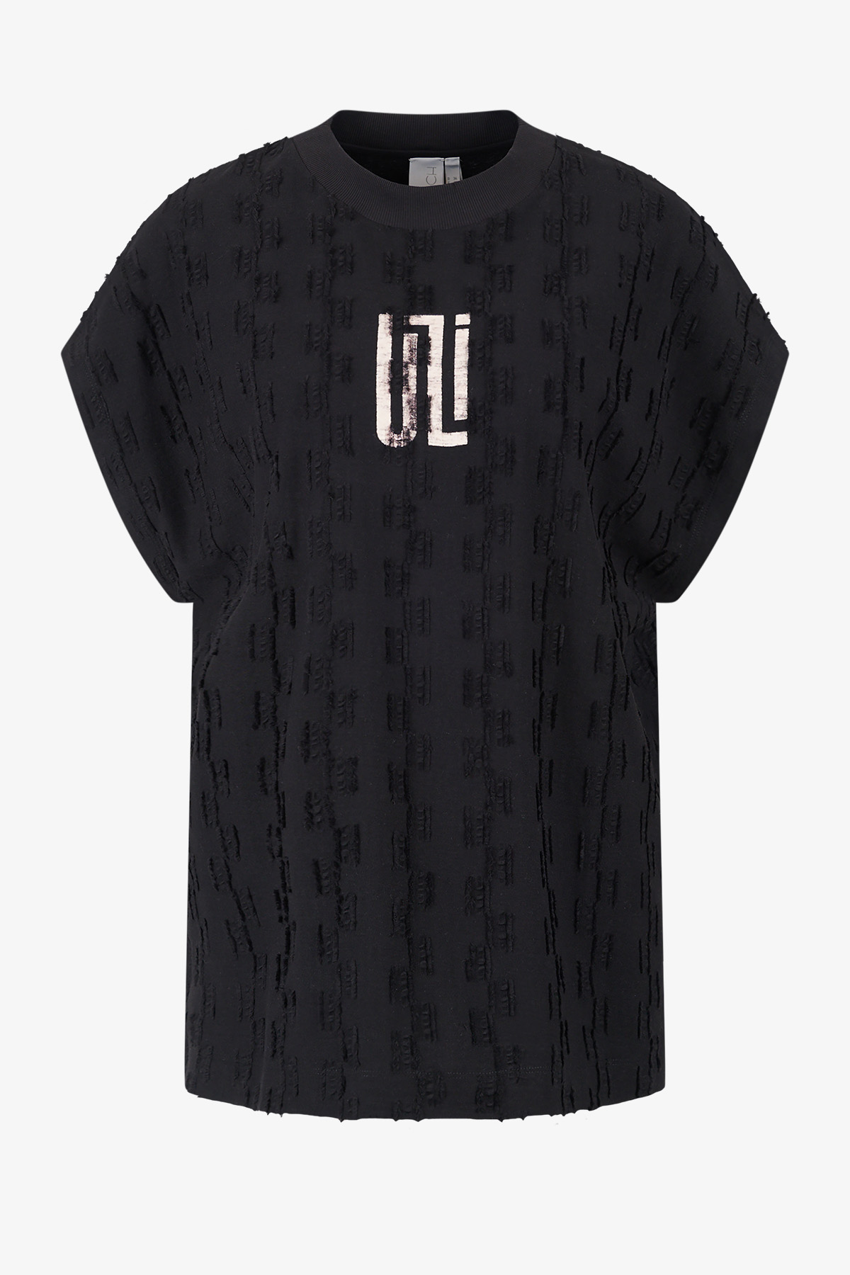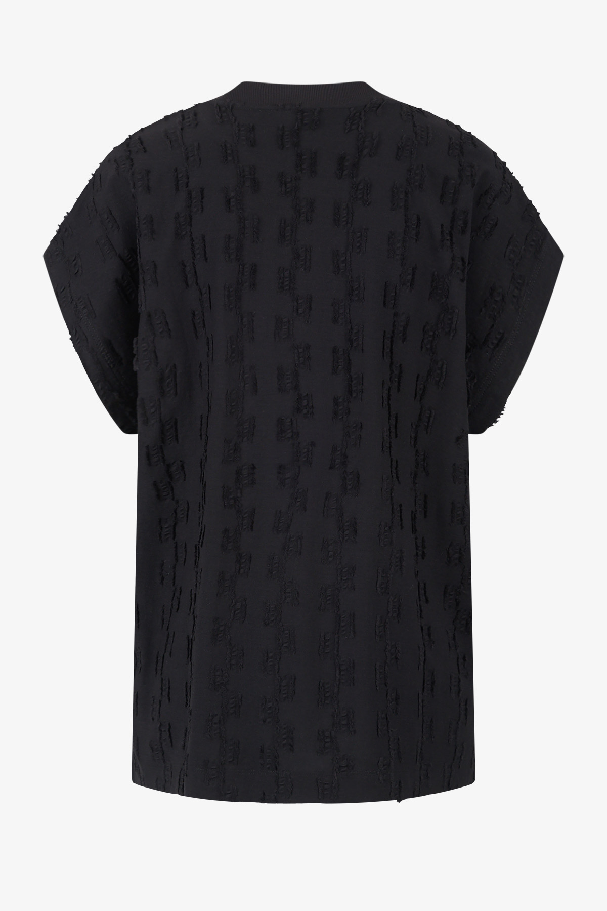 Модная оверсайз футболка из повседневного джерси отличается стильным эффектом бахромы. Выразительный логотип спереди добавляет стильный акцент и завершает трендовый образ.