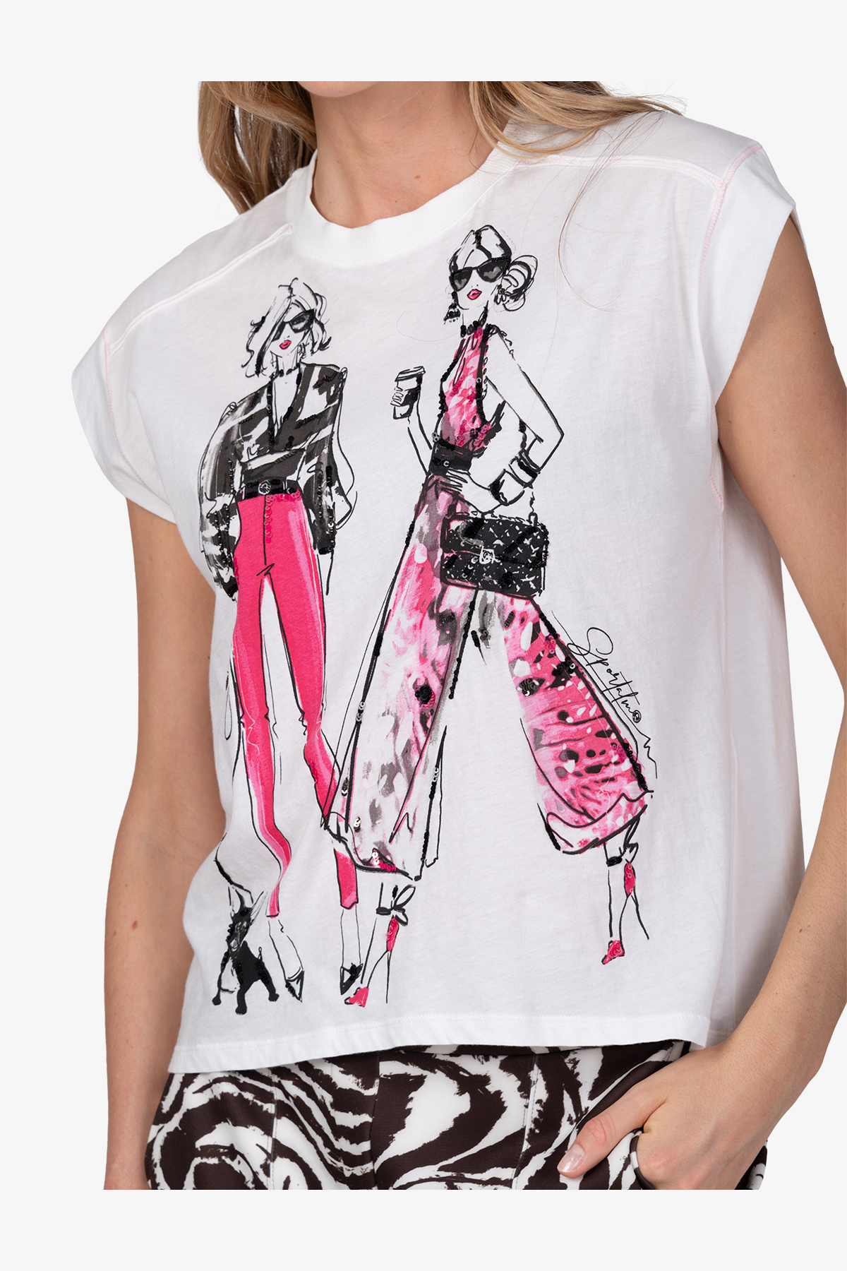 - Детали: крупная иллюстрация с декоративными элементами из бисера и пайеток спереди, спортивные декоративные швы, закругленный низ, удлиненный сзади