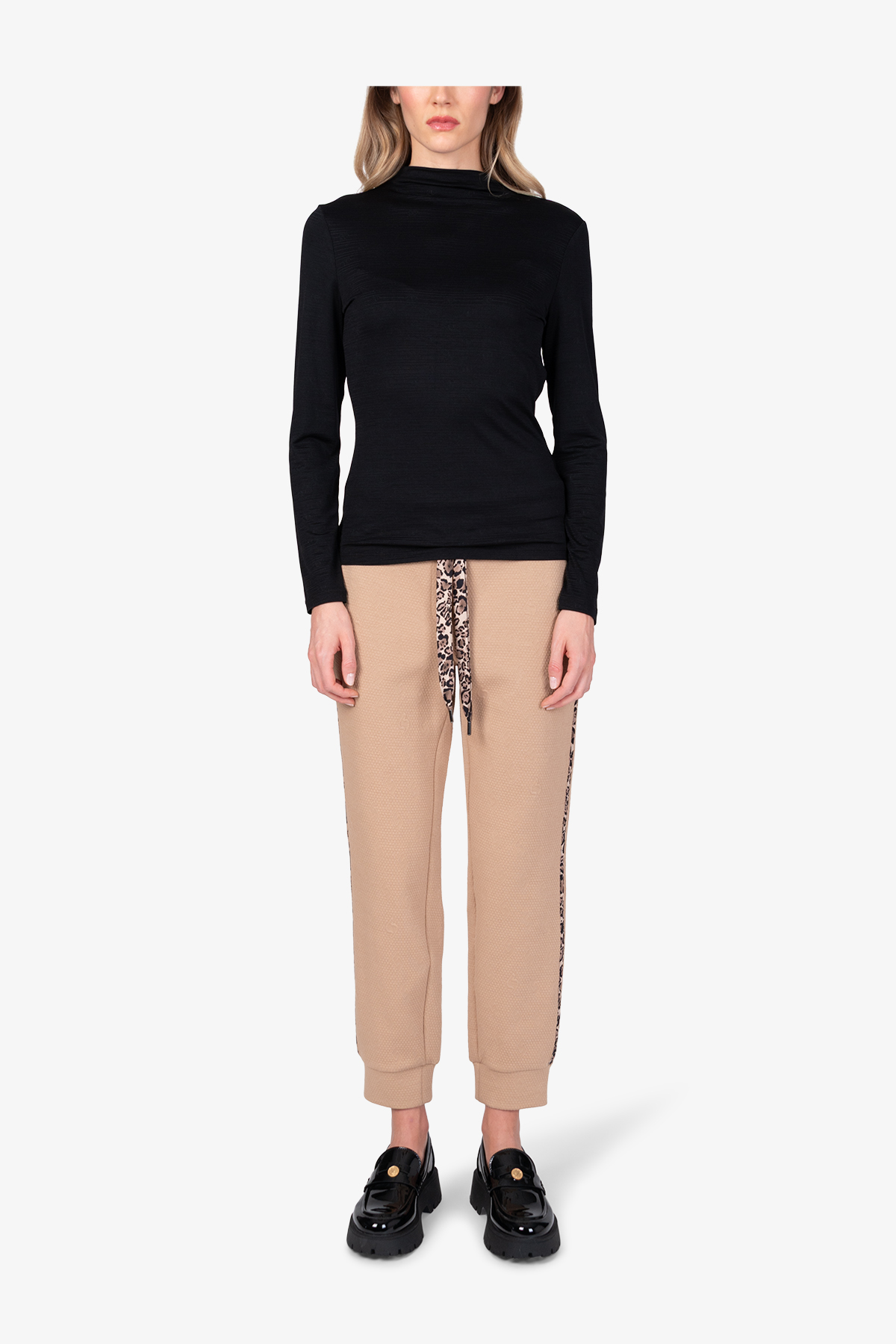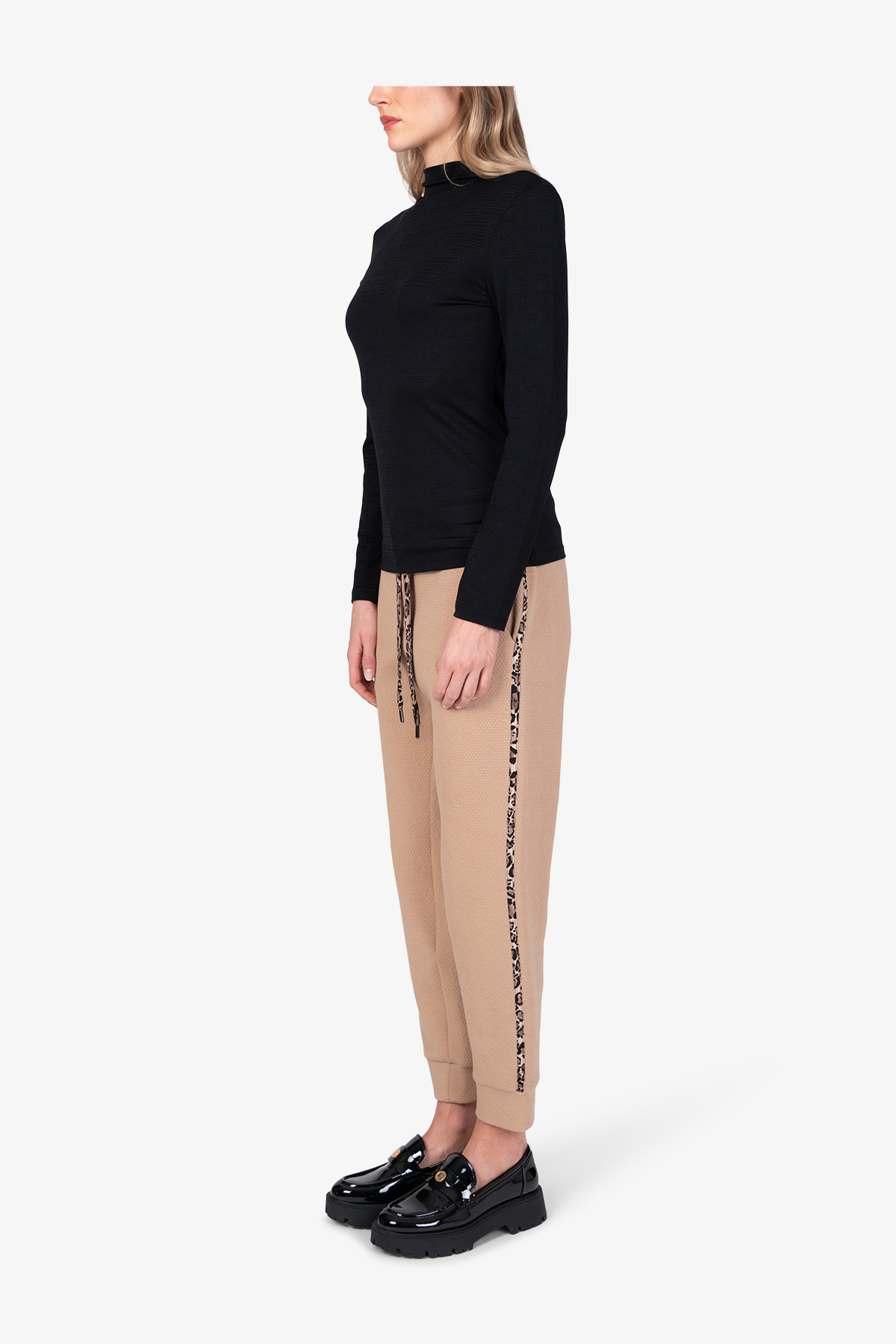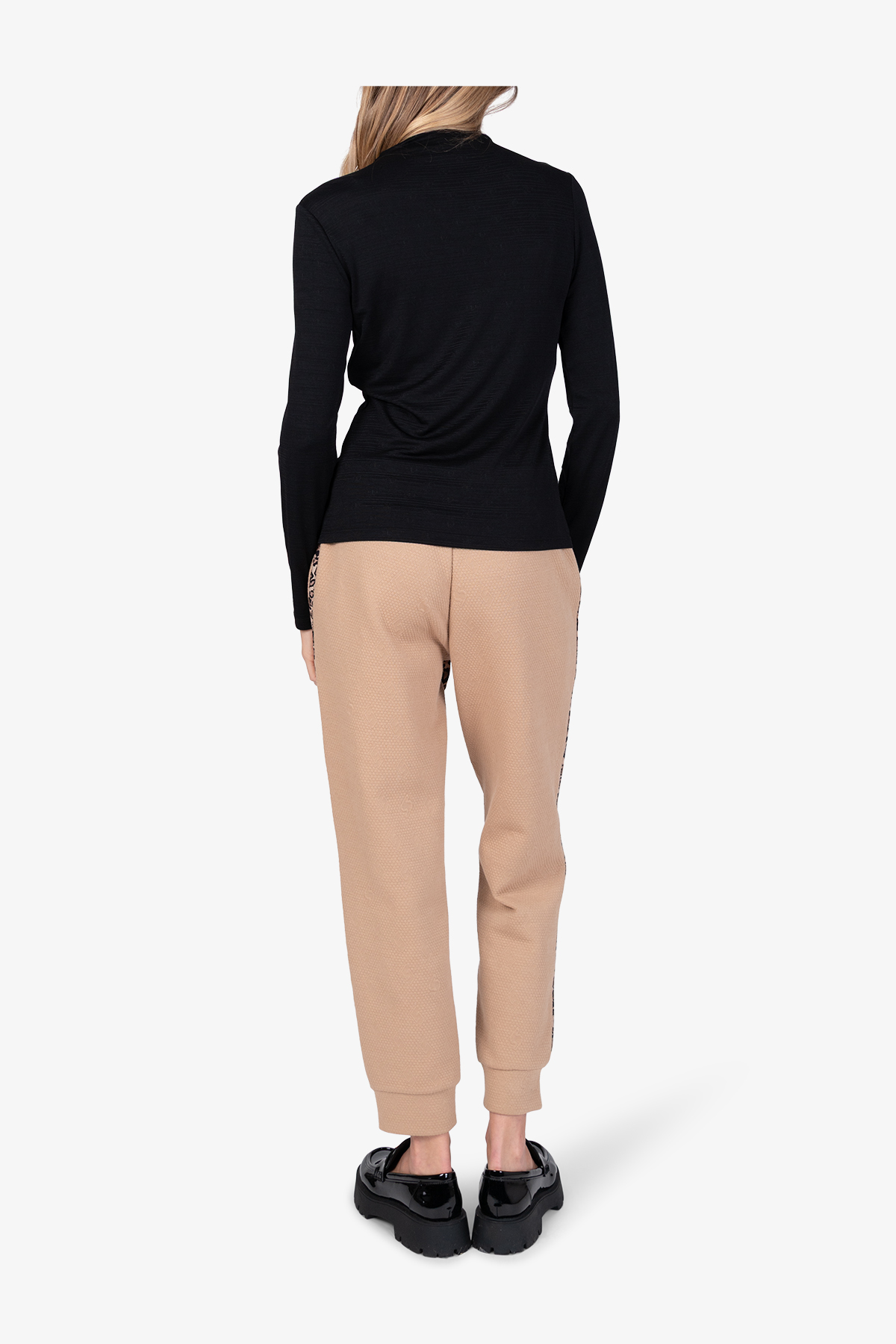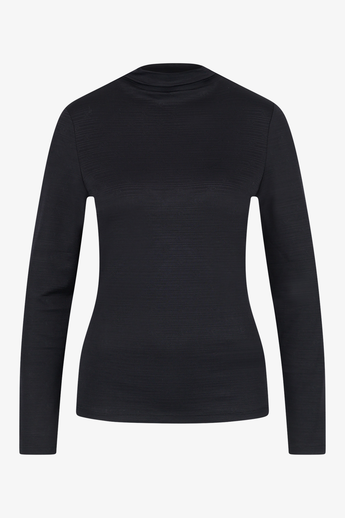 Лонгслив высокого качества с воротником-стойкой и сдержанным жаккардовым узором впечатляет элегантным видом.