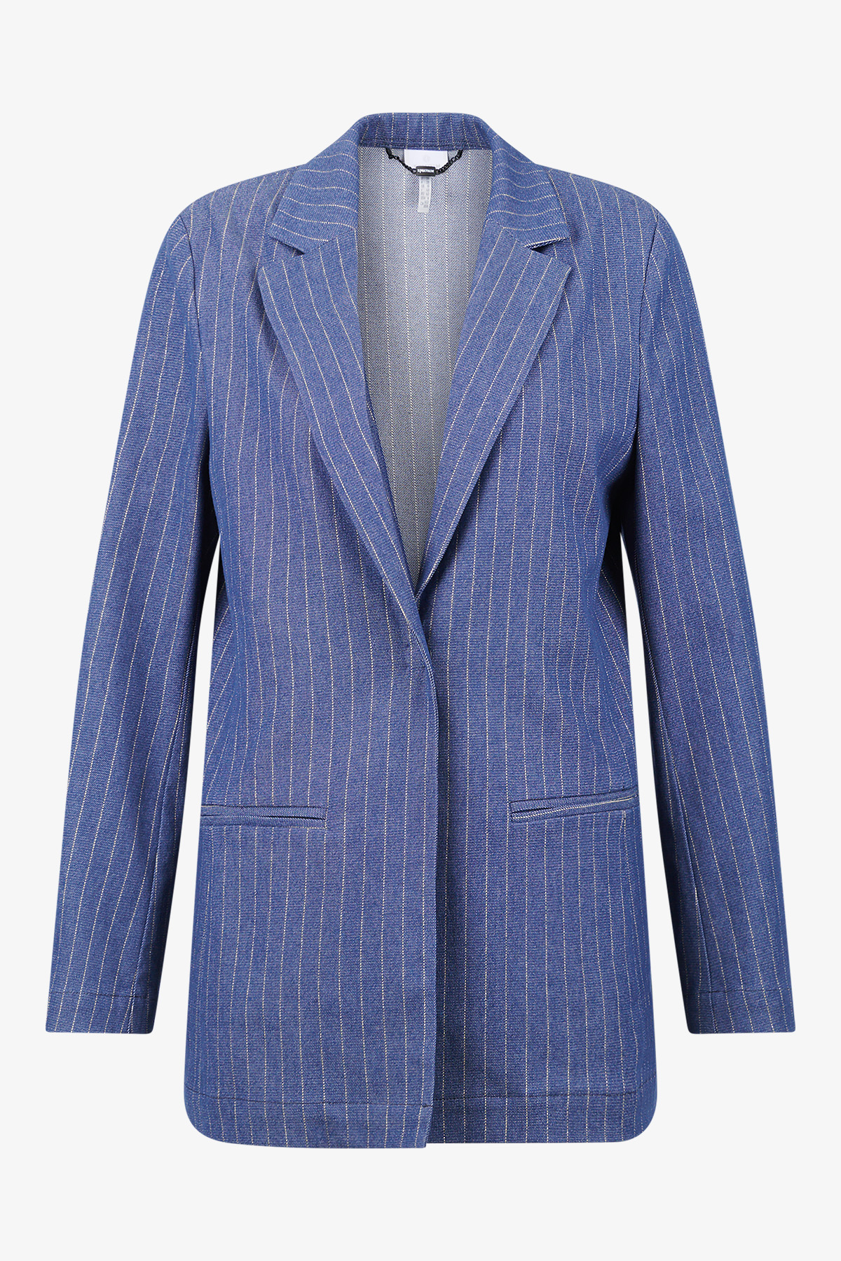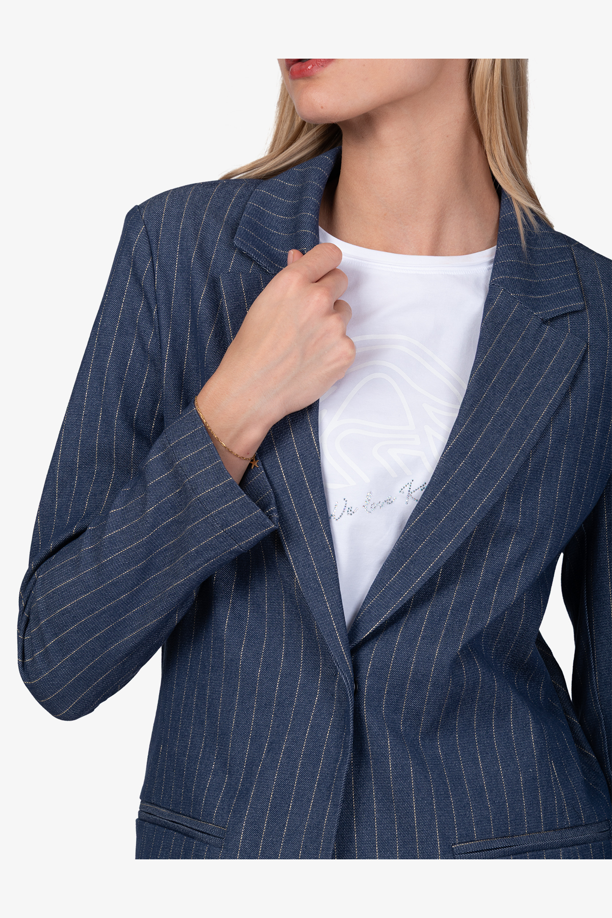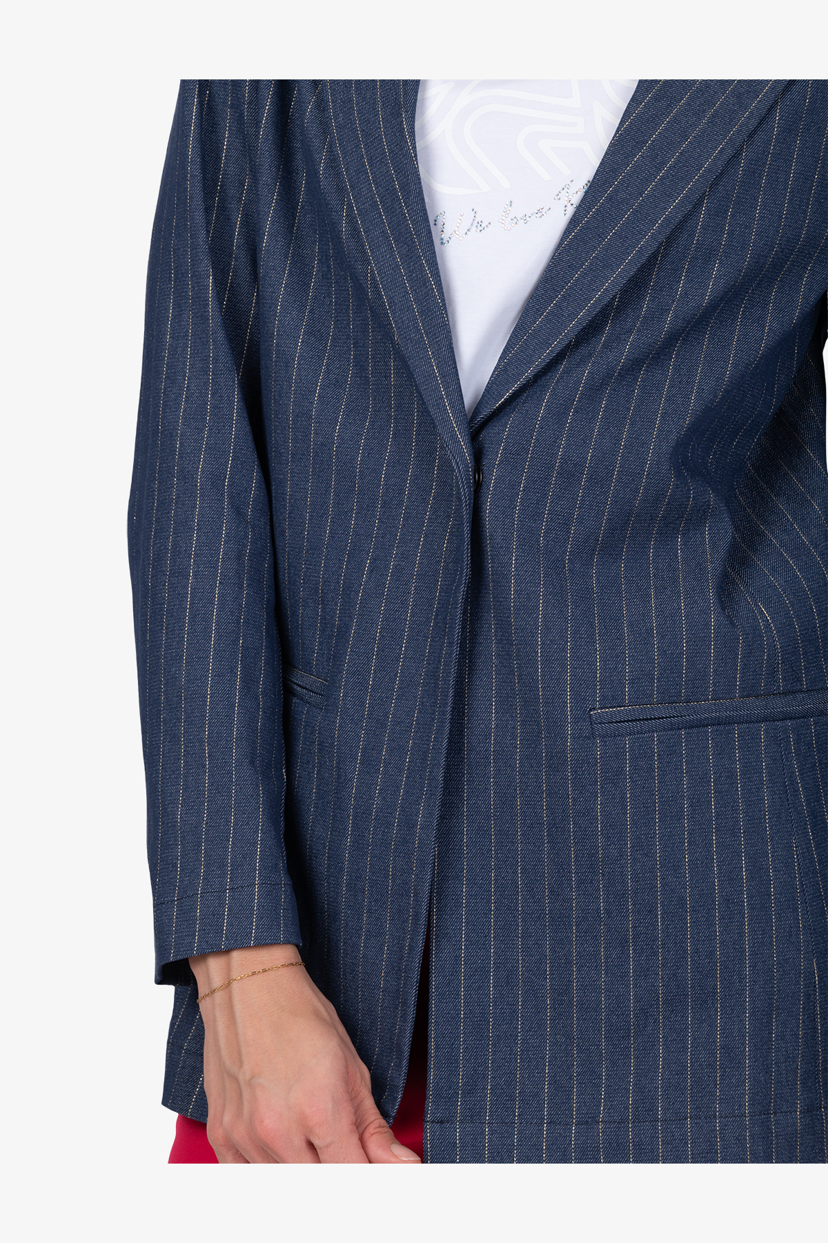 Казуальный блейзер в изысканной тонкой полоске впечатляет лаконичным дизайном.