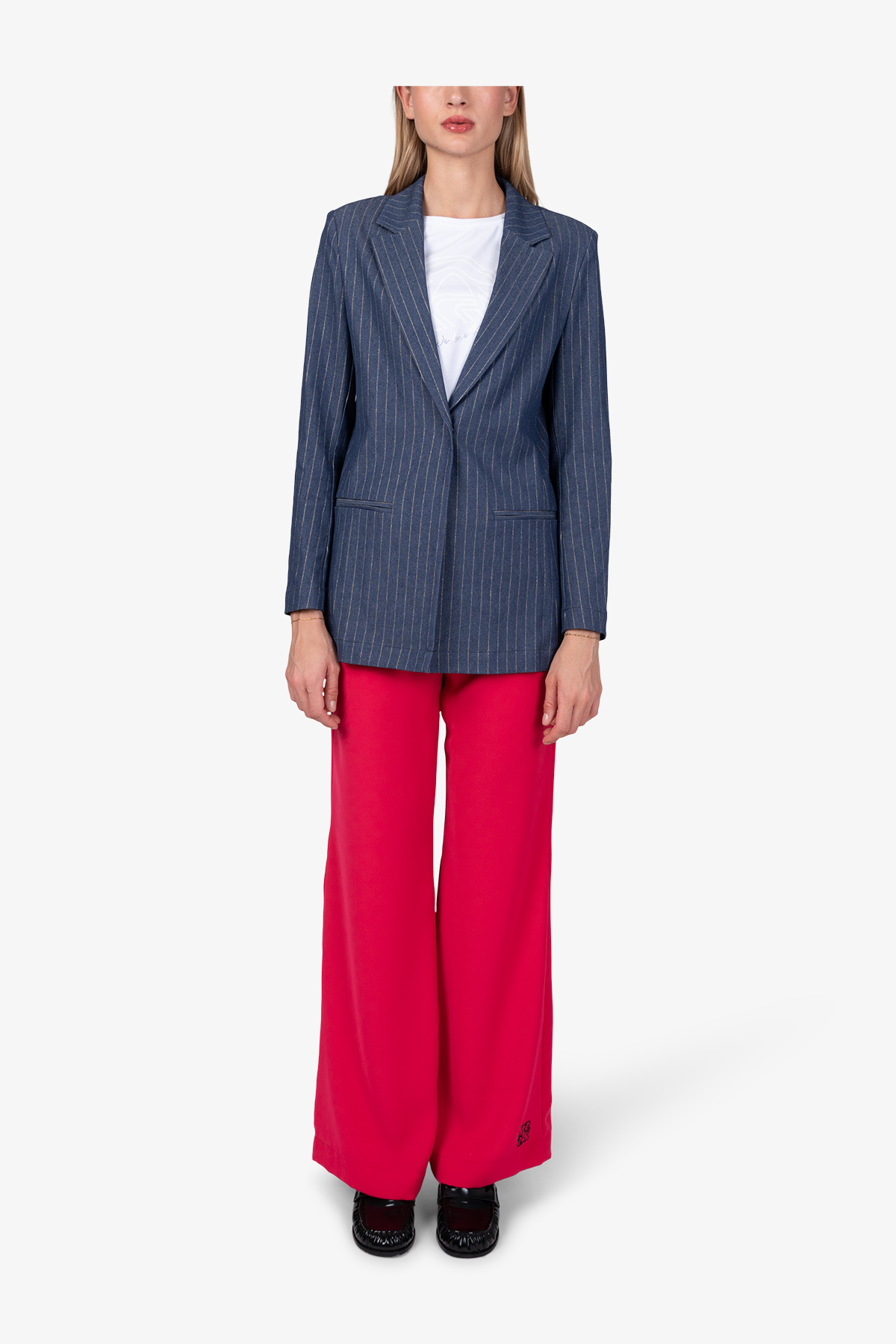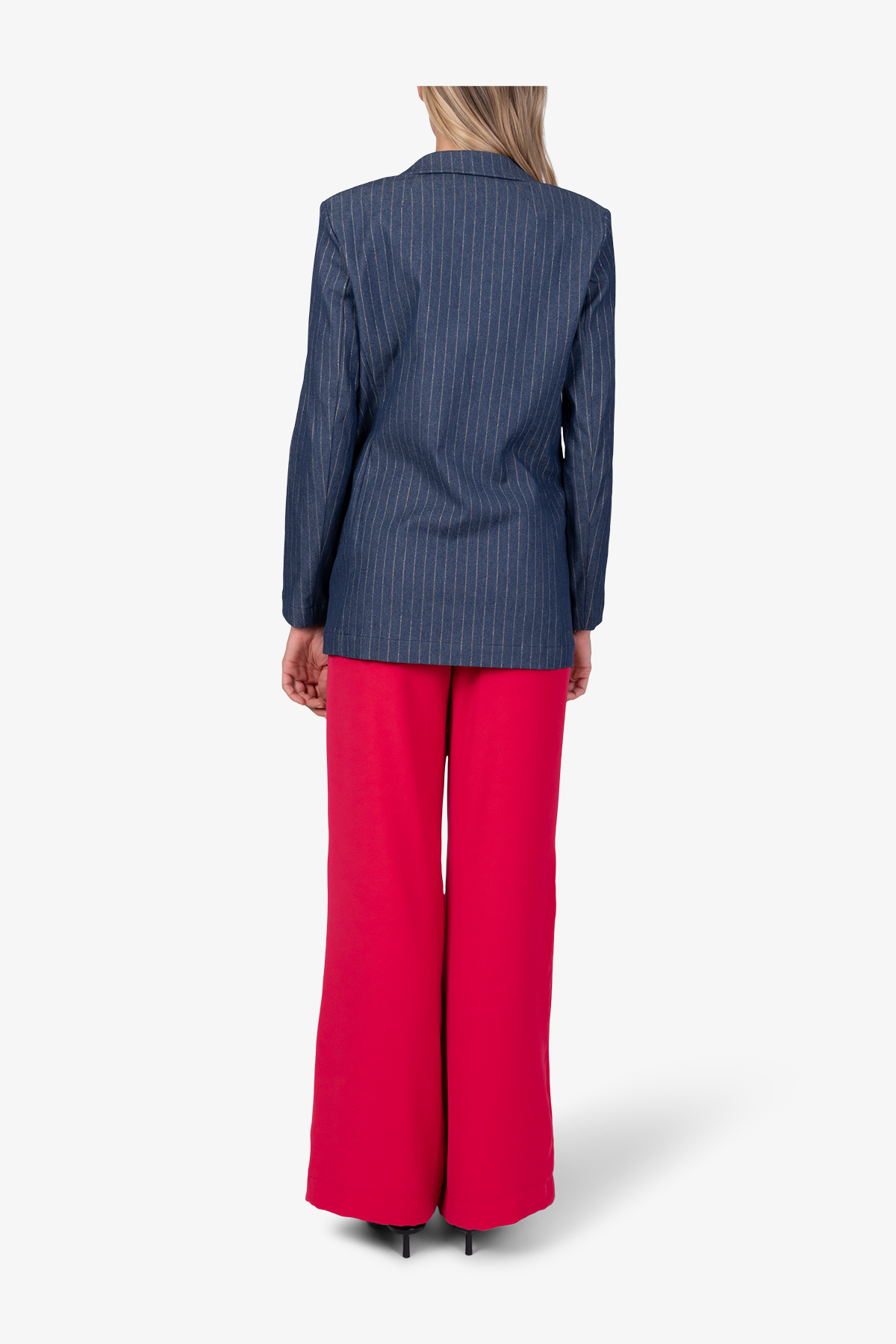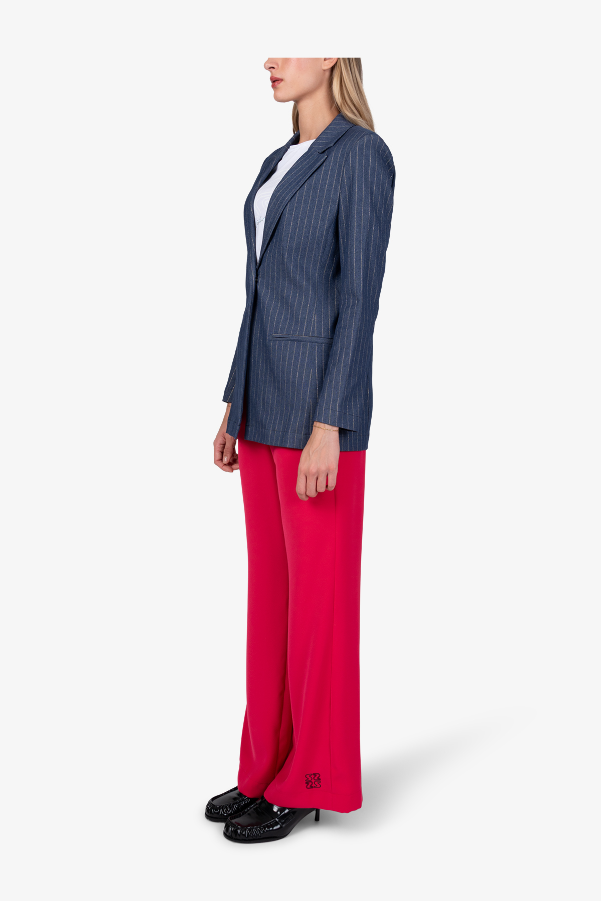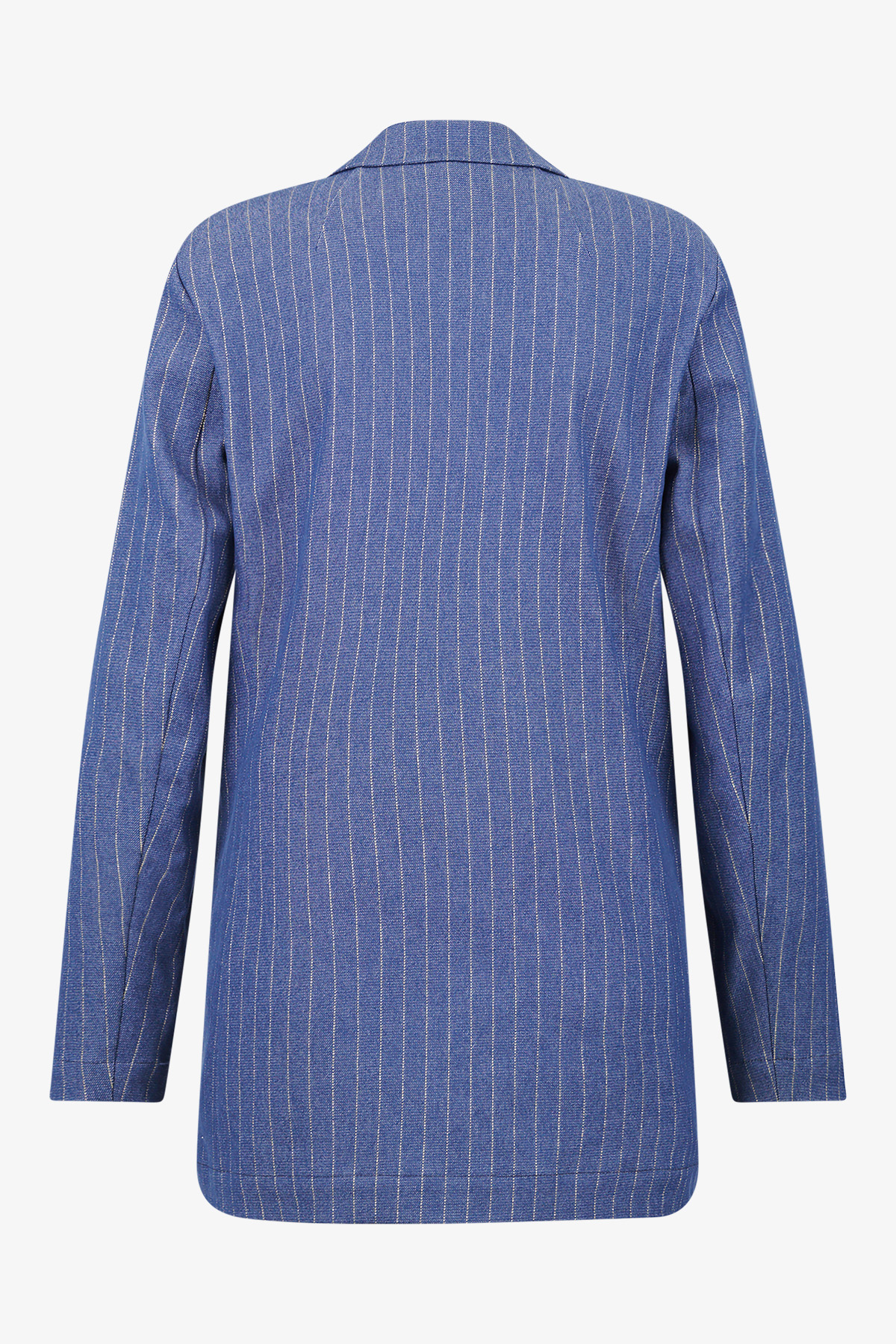 Казуальный блейзер в изысканной тонкой полоске впечатляет лаконичным дизайном.