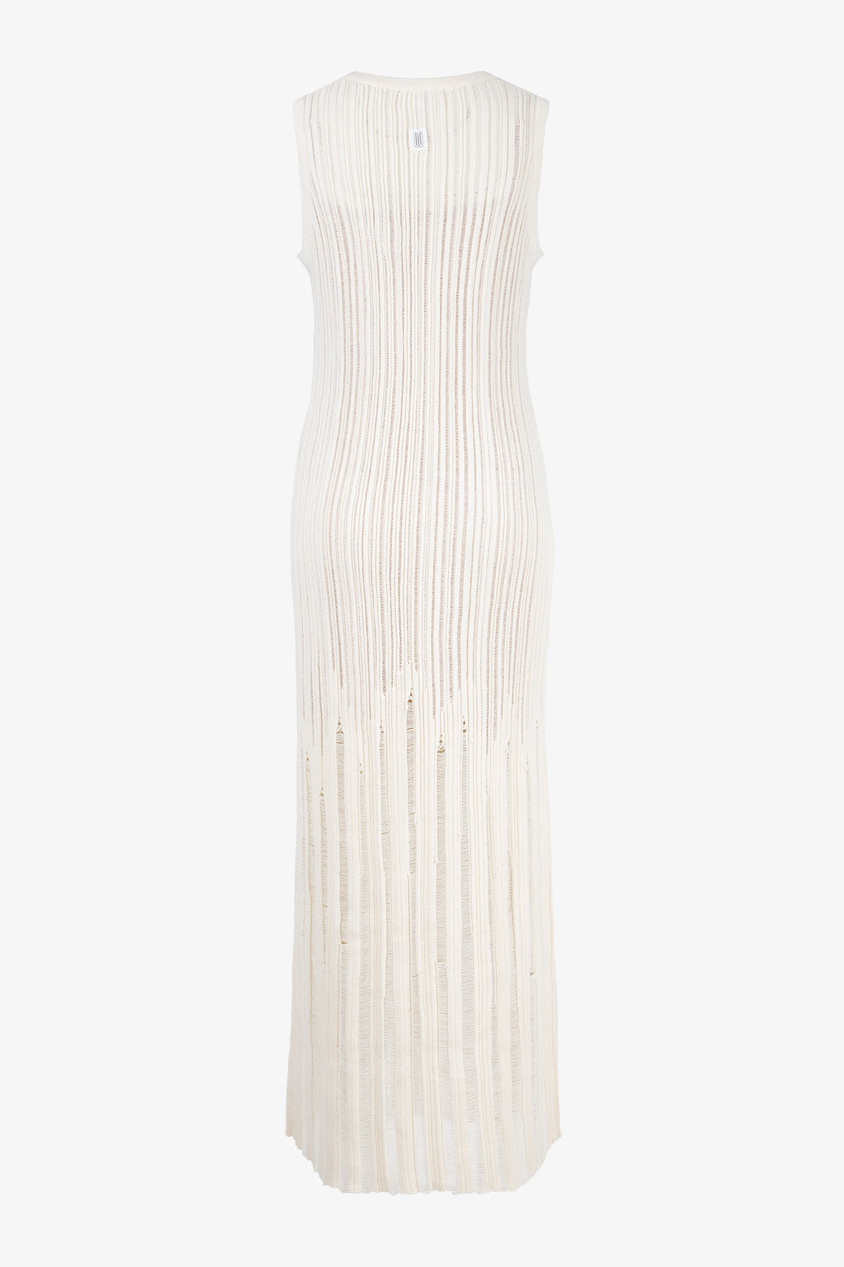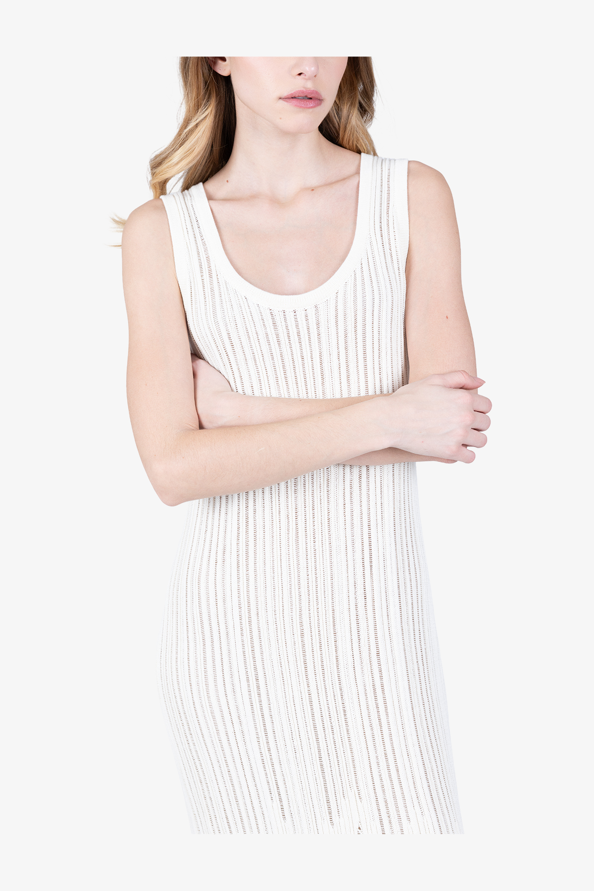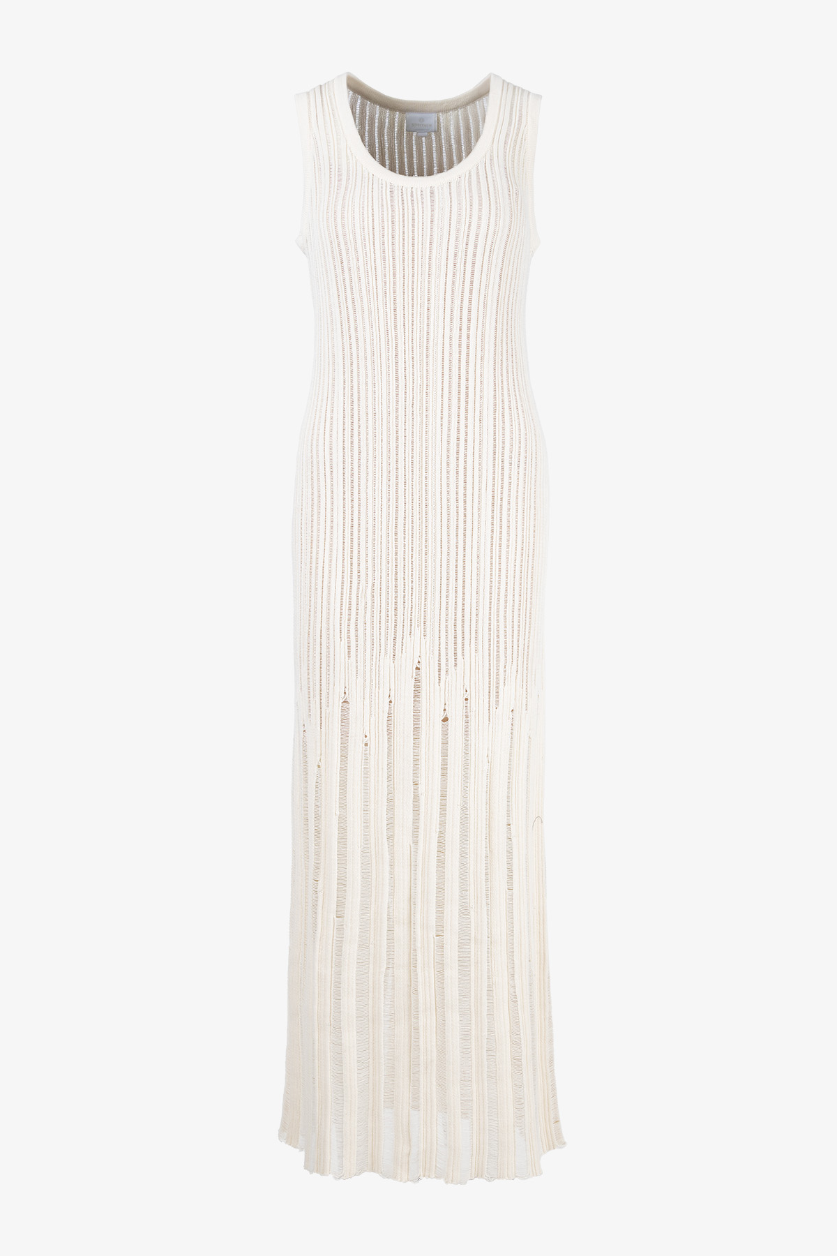 Вязаное платье без рукавов выполнено из зернистой хлопковой пряжи и отличается особой техникой вязки. Графический ажурный узор придает платью современный и воздушный вид.