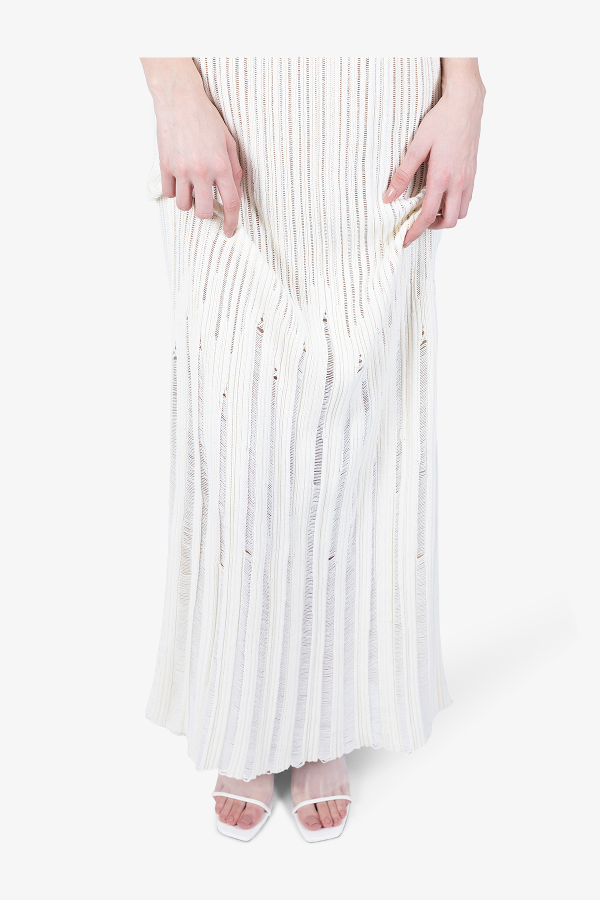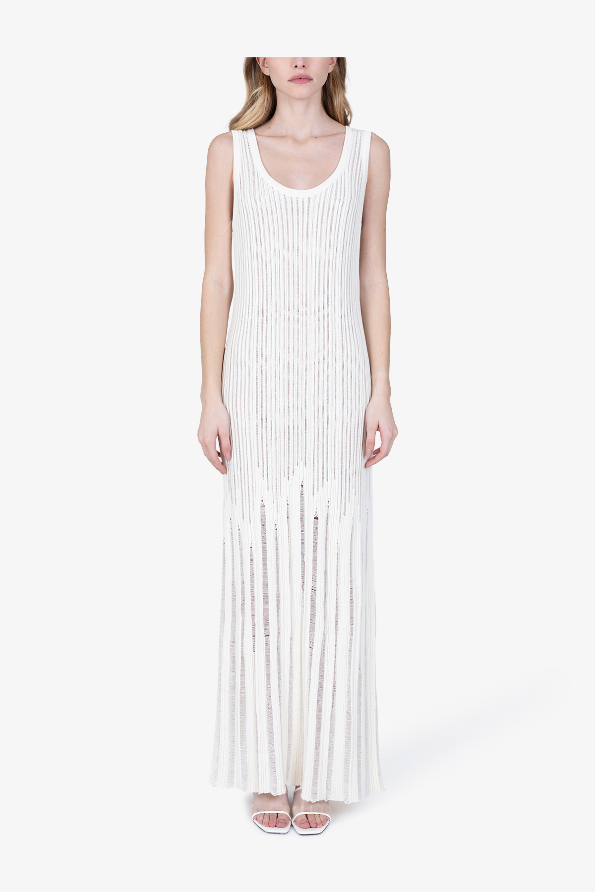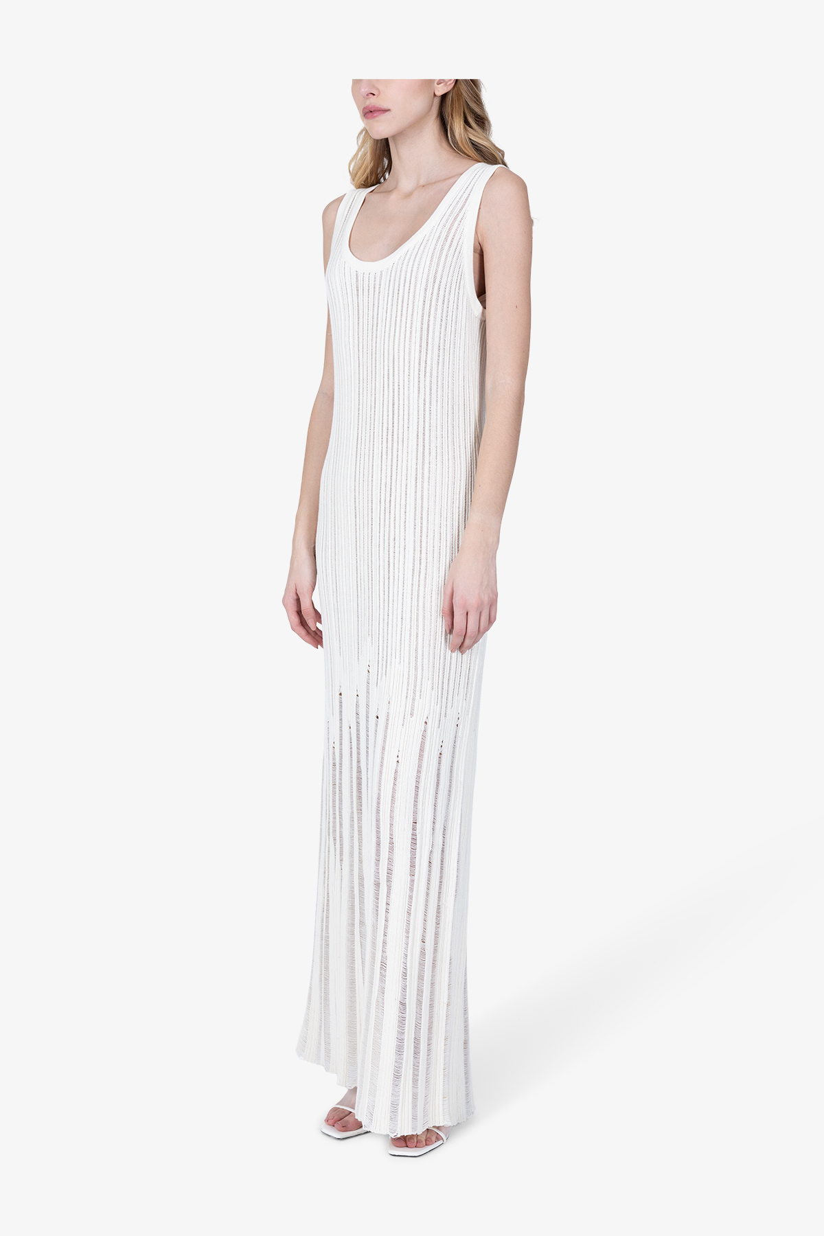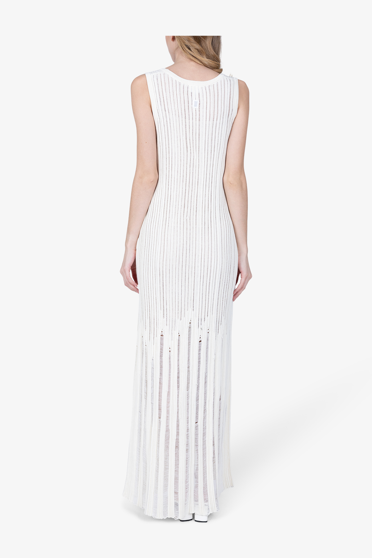 Вязаное платье без рукавов выполнено из зернистой хлопковой пряжи и отличается особой техникой вязки. Графический ажурный узор придает платью современный и воздушный вид.