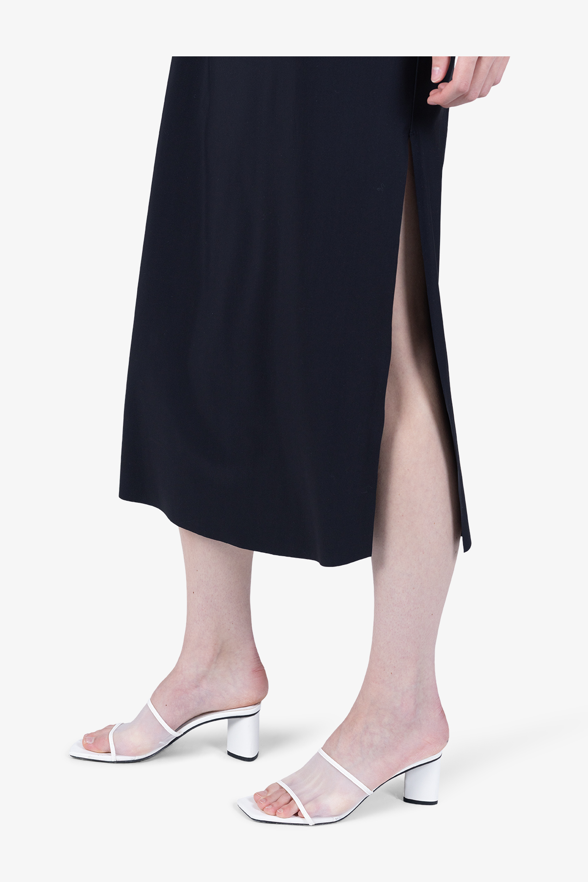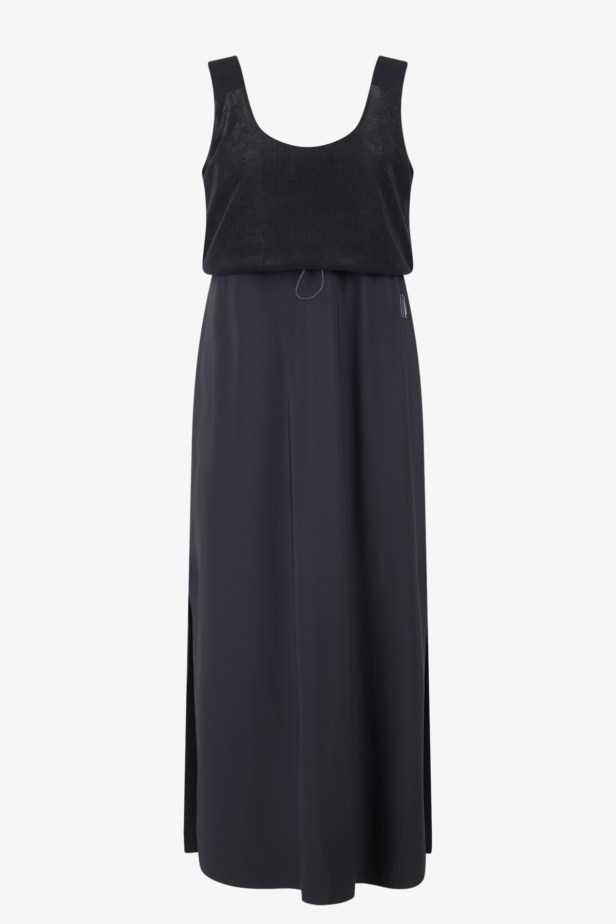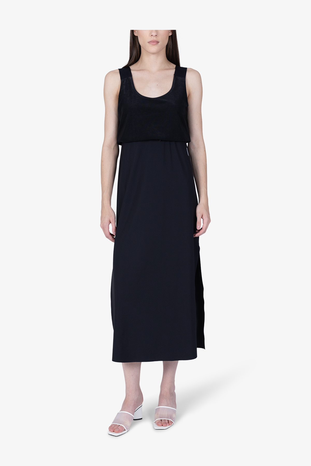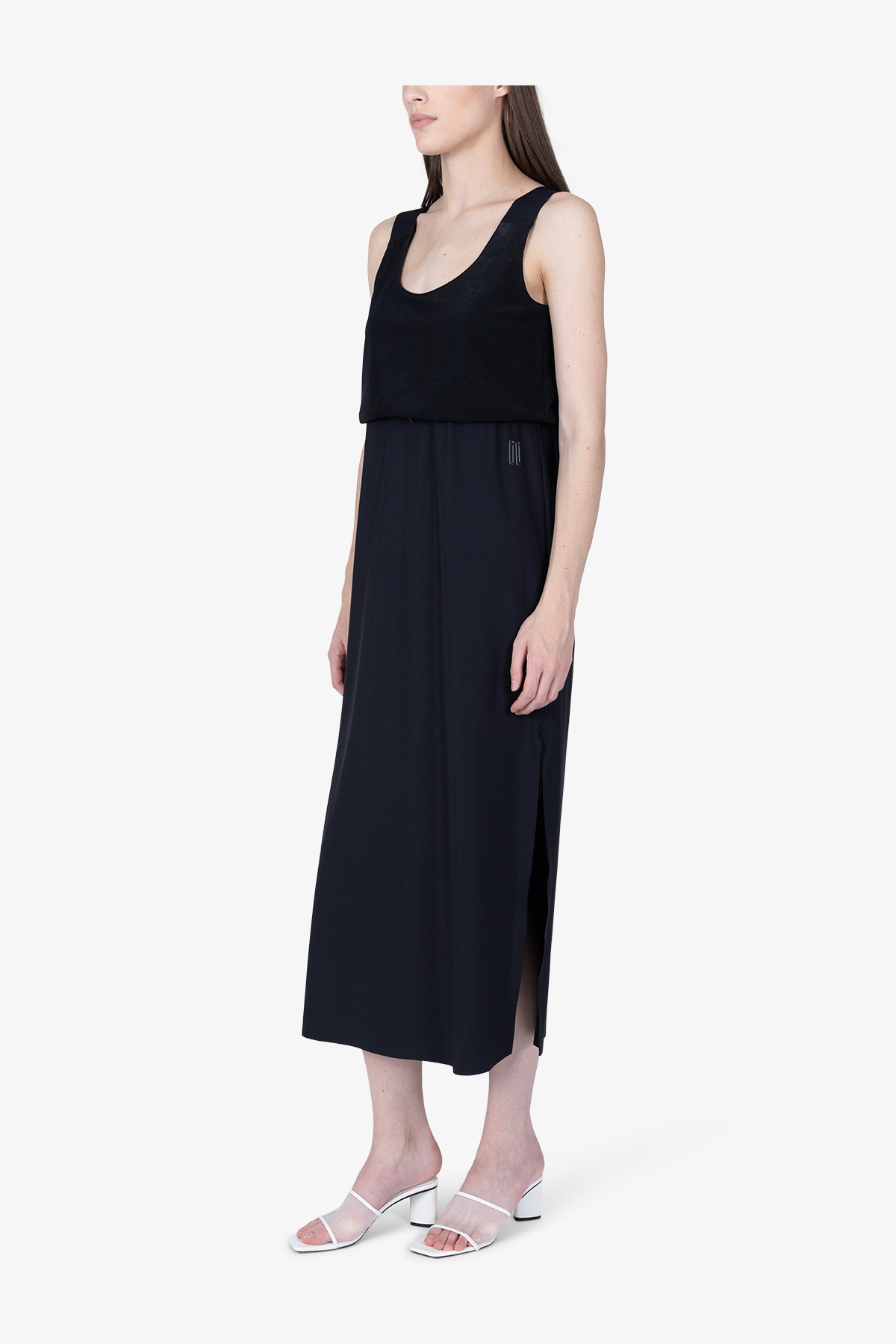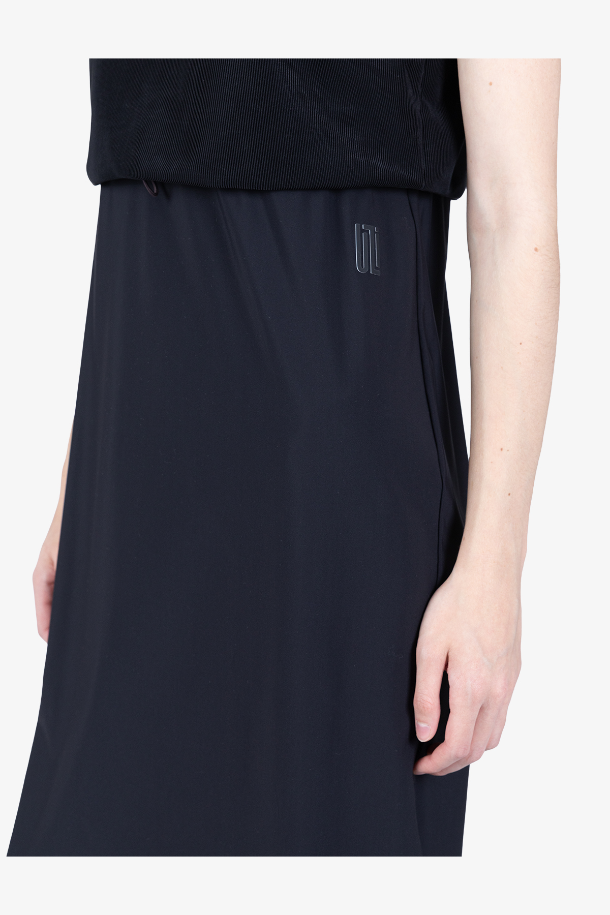 - Детали: юбка с отделкой открытыми срезами, скрытая кулиска под линией ампир, высокие боковые разрезы, трансферный логотип ULLI на левой части юбки под линией ампир