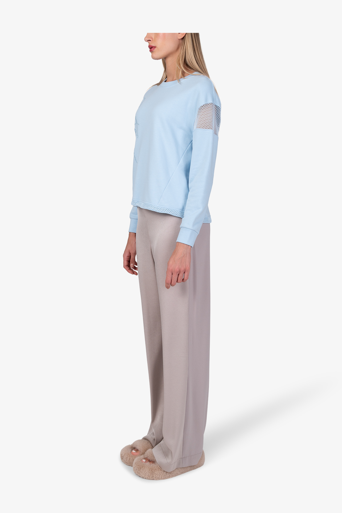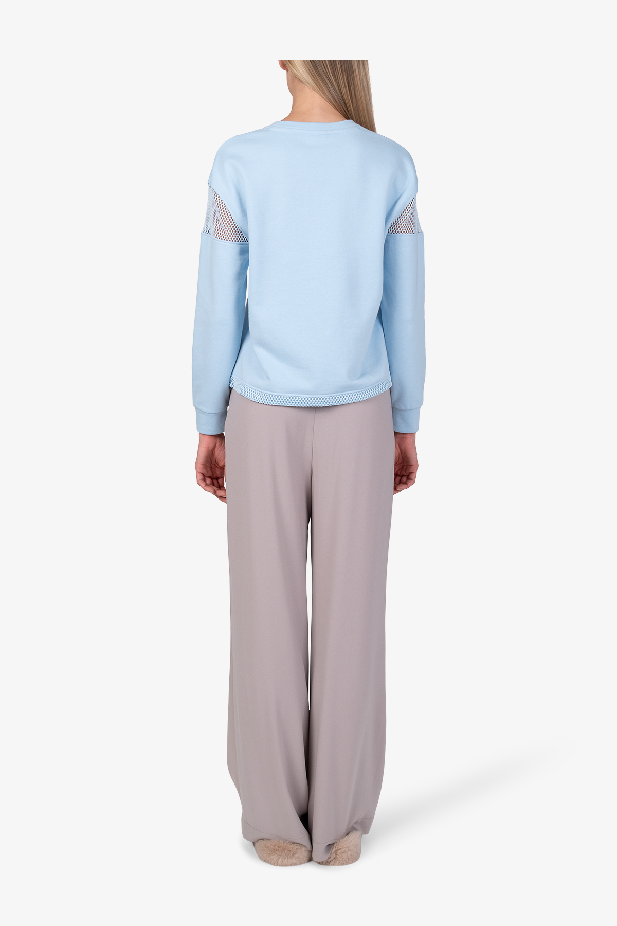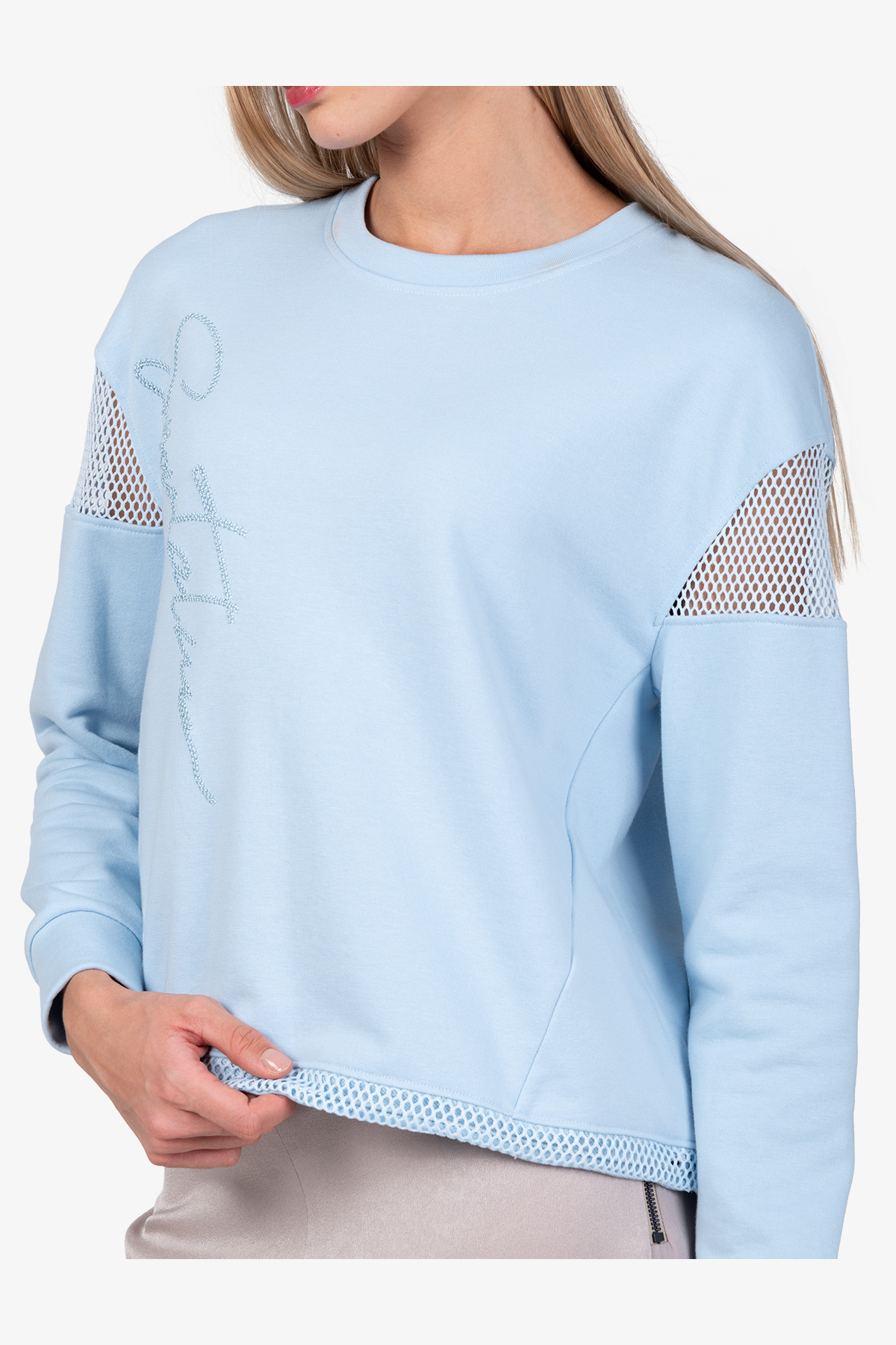 - Длинные рукава с манжетами, опущенные плечи с сетчатыми вставками