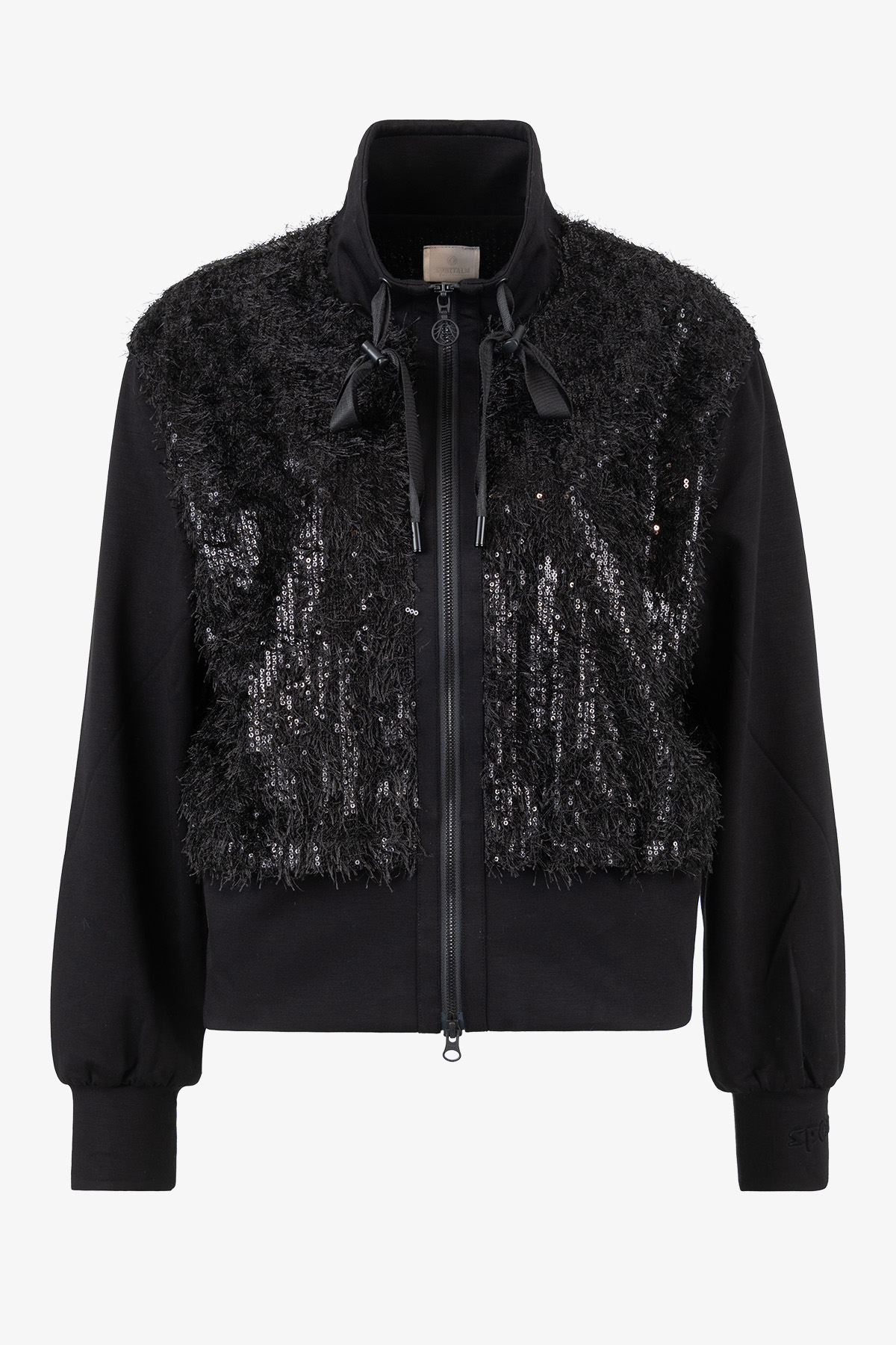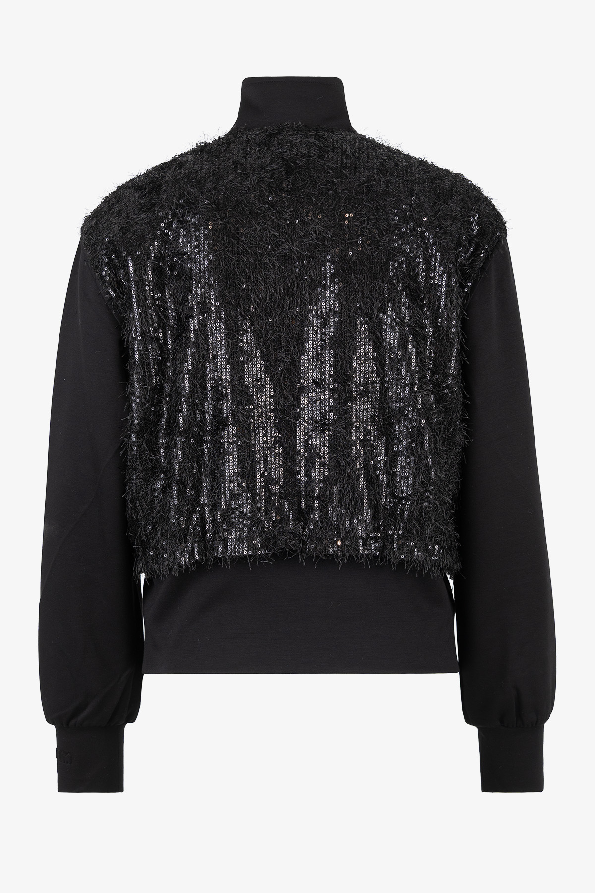 Изысканная куртка-свитшот обеспечивает повседневную элегантность, в то время как основа с пушистыми пайетками добавляет гламурные акценты.