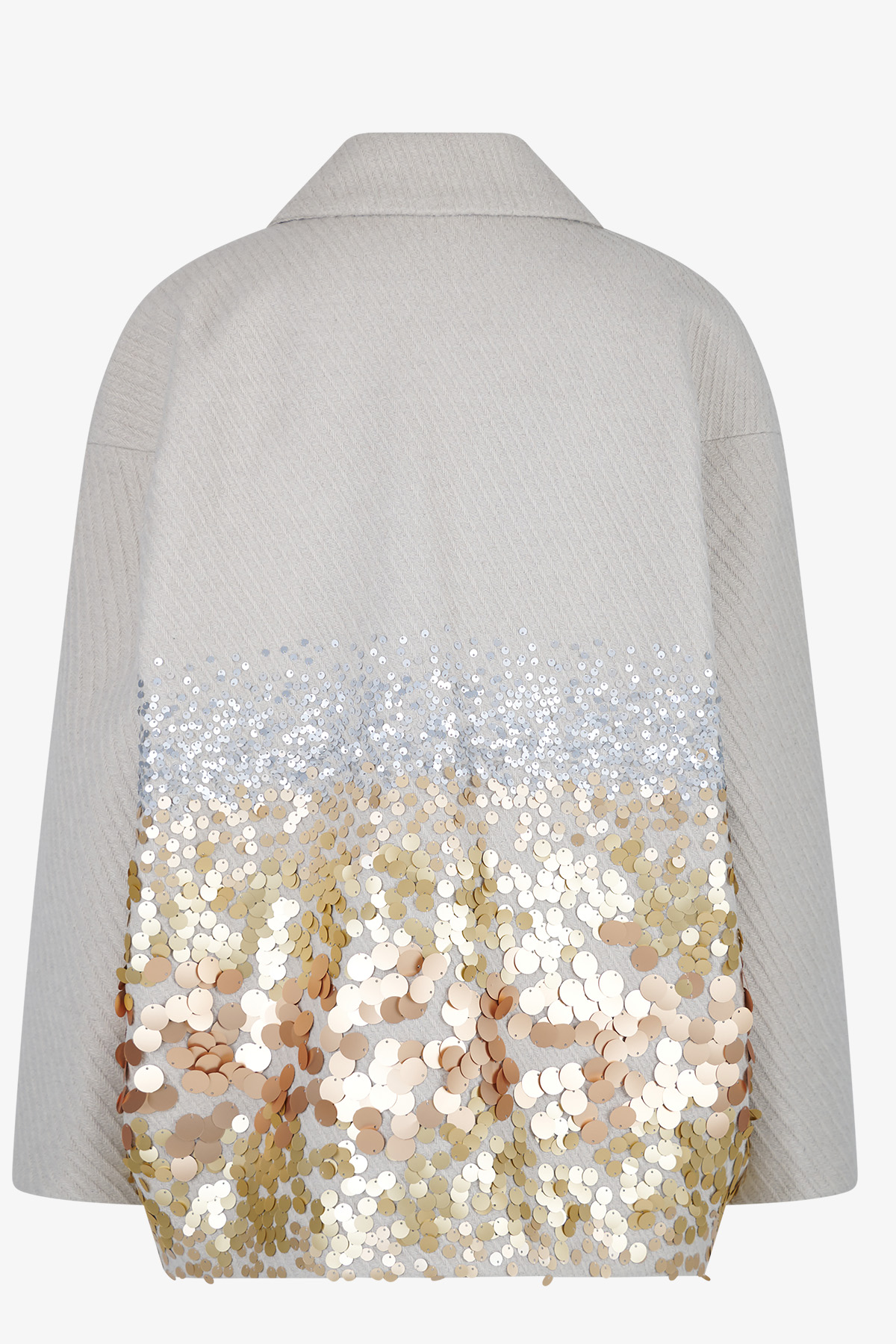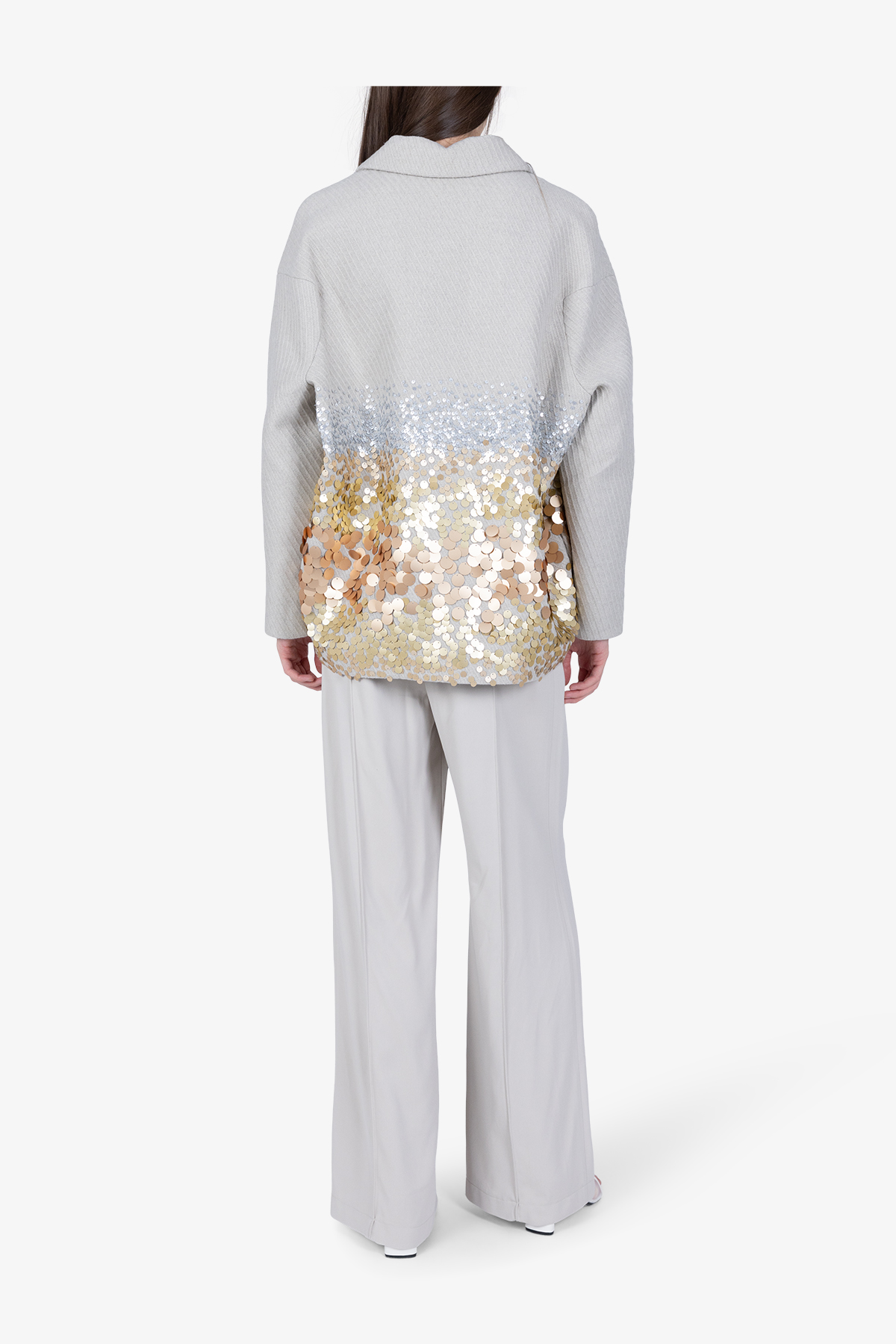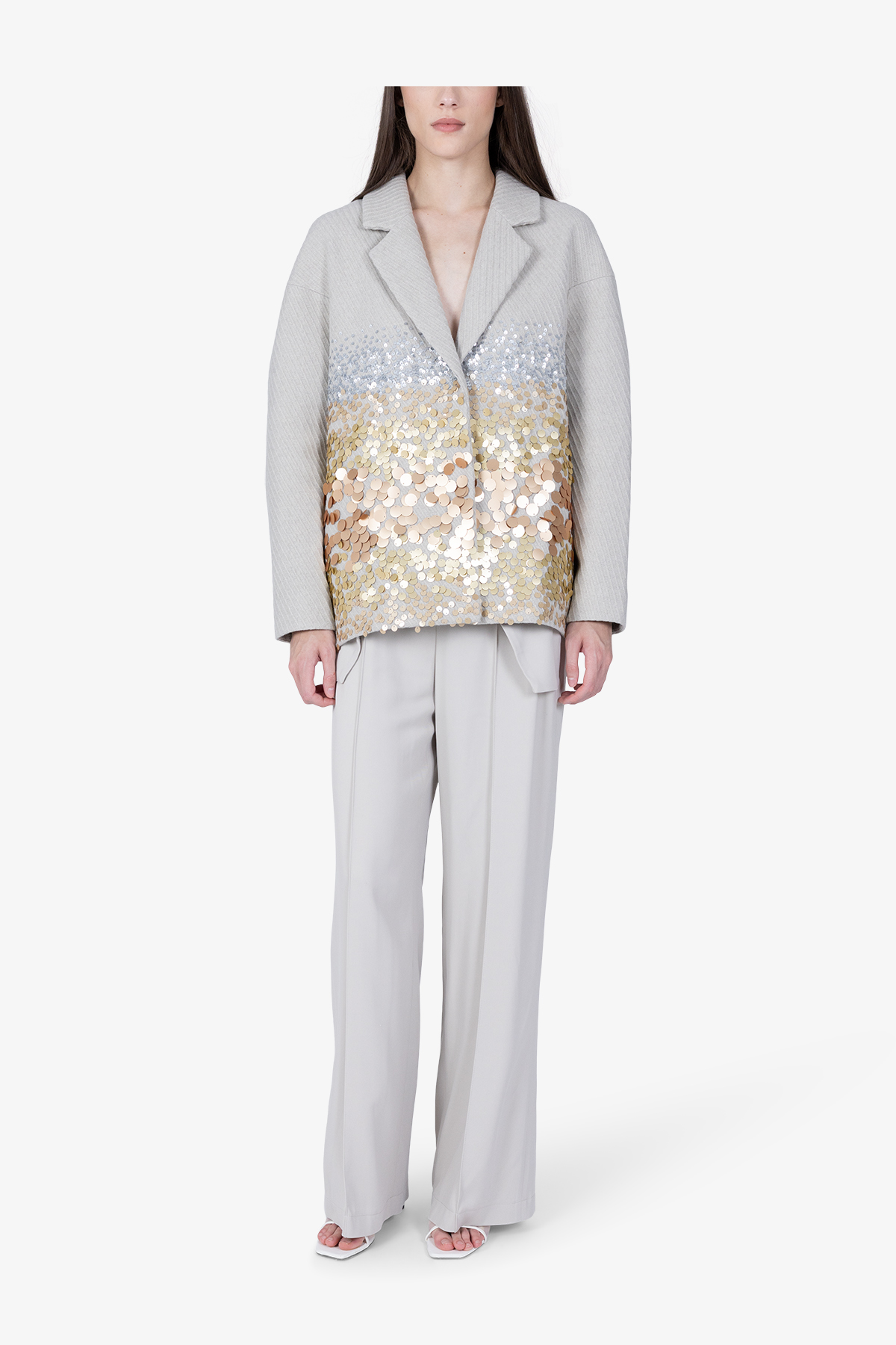 Модное пальто оверсайз с впечатляющий сложной отделкой пайетками. Оно добавляет гламура любому образу и подчеркивает стильный внешний вид.