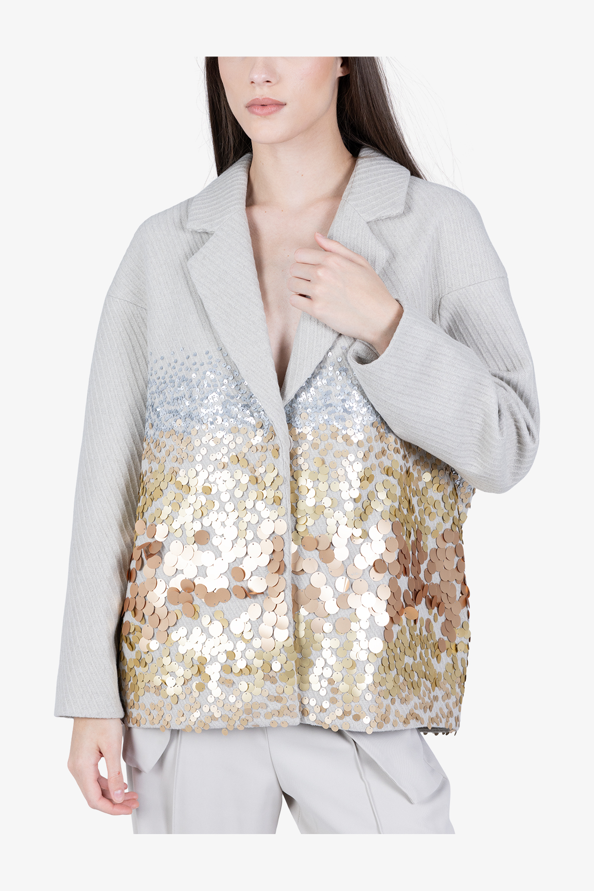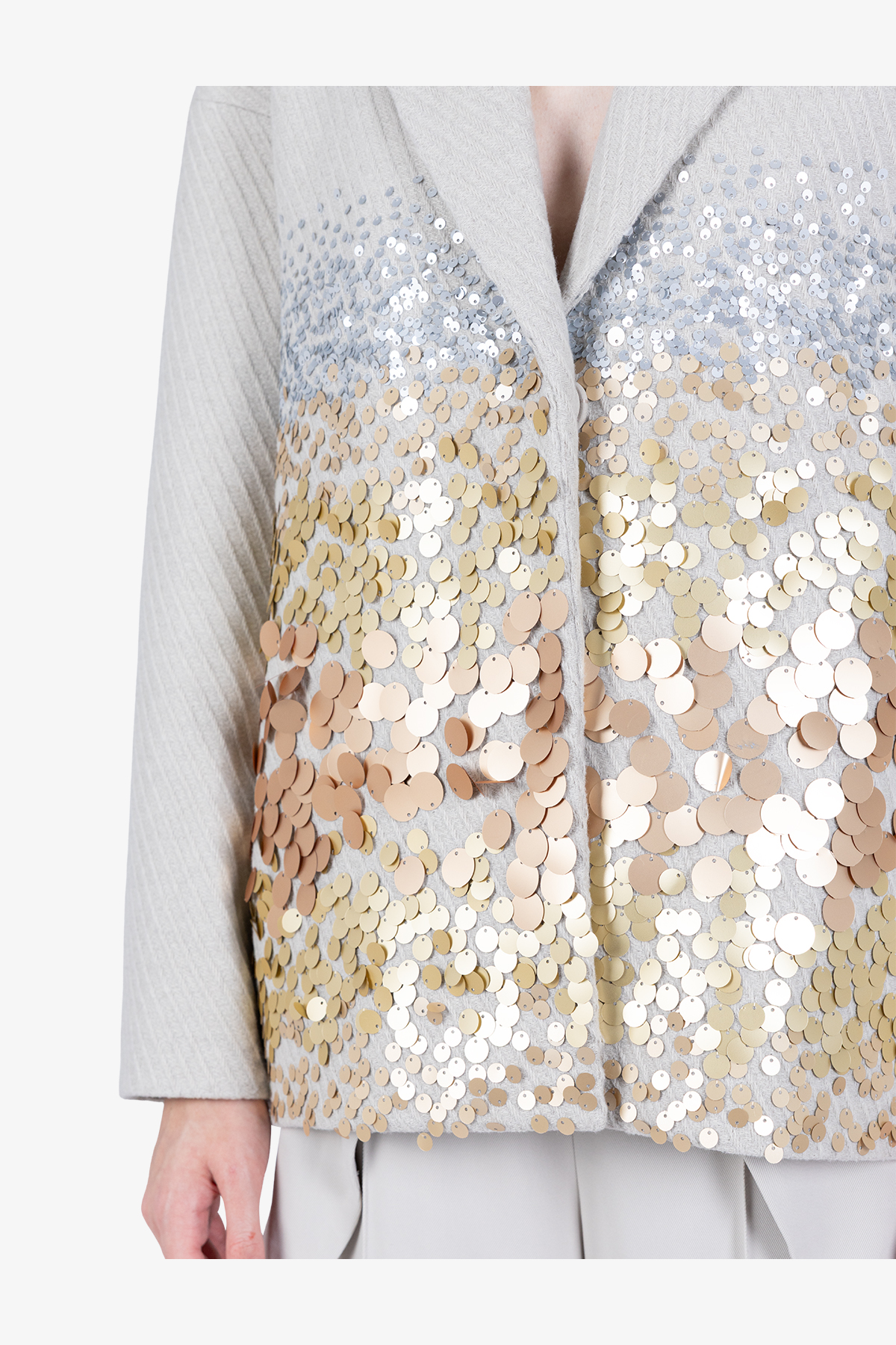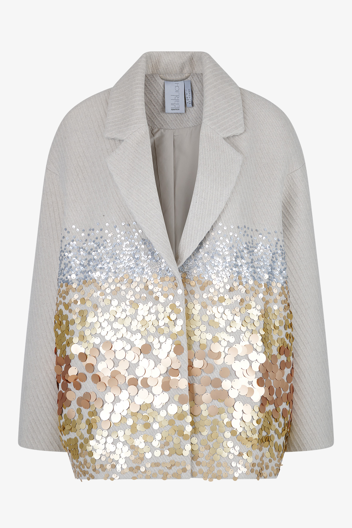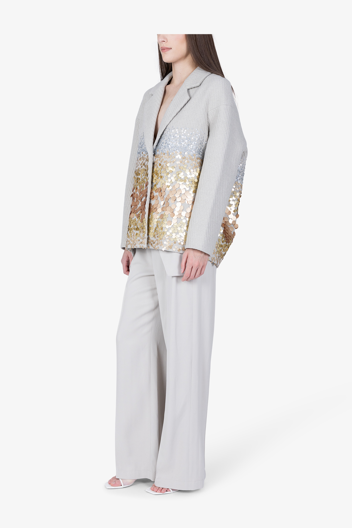 Модное пальто оверсайз с впечатляющий сложной отделкой пайетками. Оно добавляет гламура любому образу и подчеркивает стильный внешний вид.