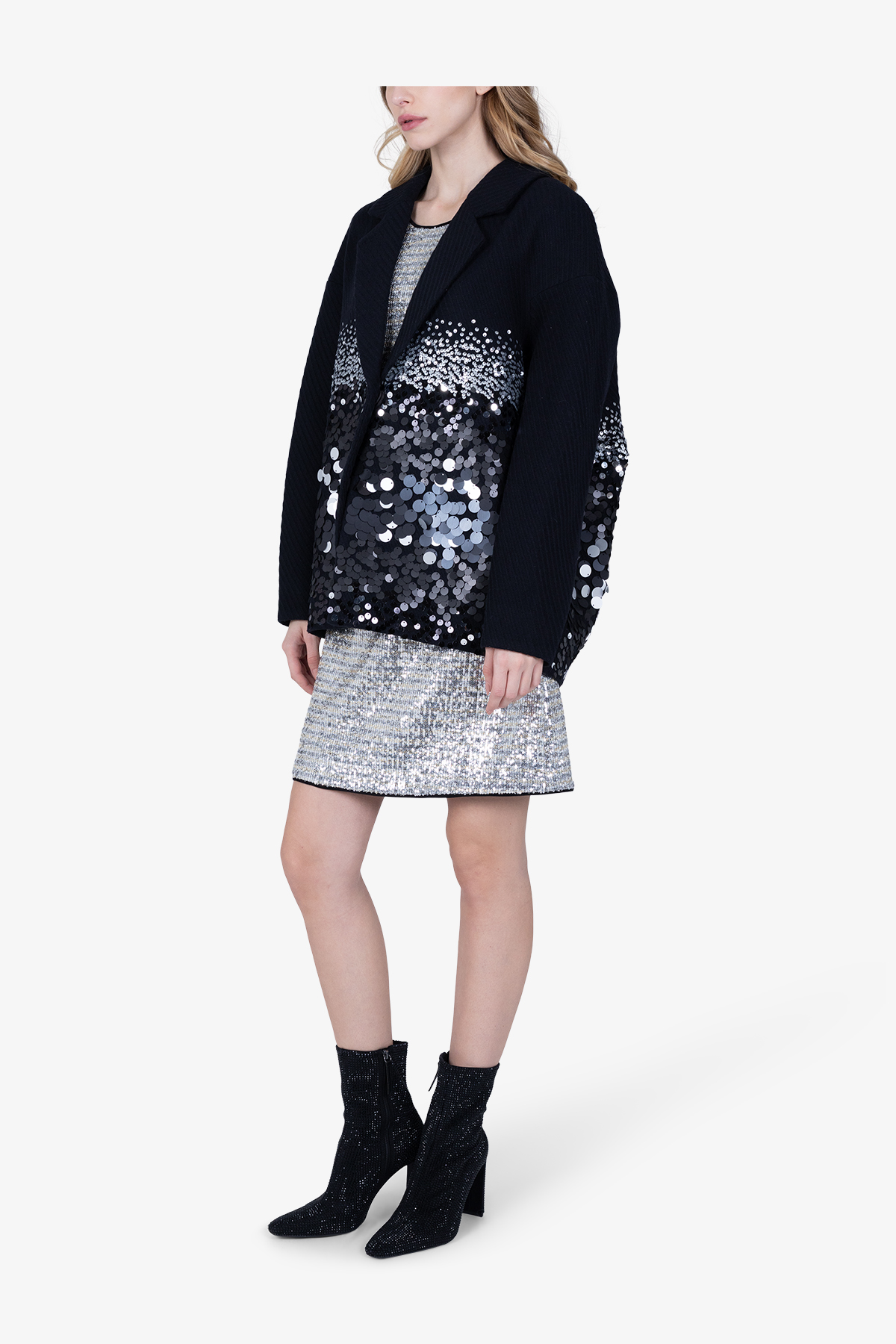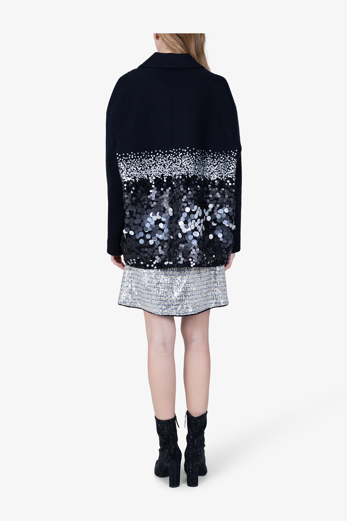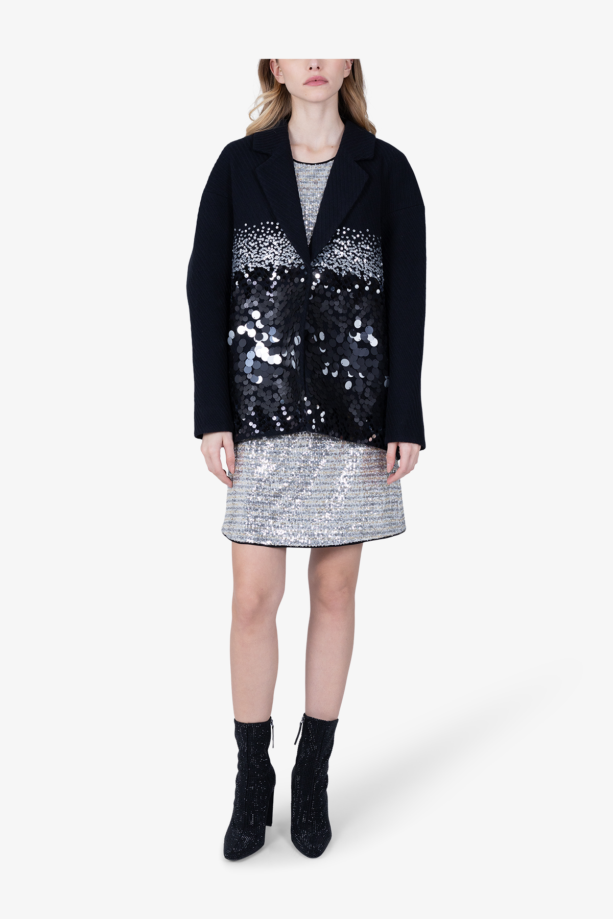 Модное пальто оверсайз с впечатляющий сложной отделкой пайетками. Оно добавляет гламура любому образу и подчеркивает стильный внешний вид.