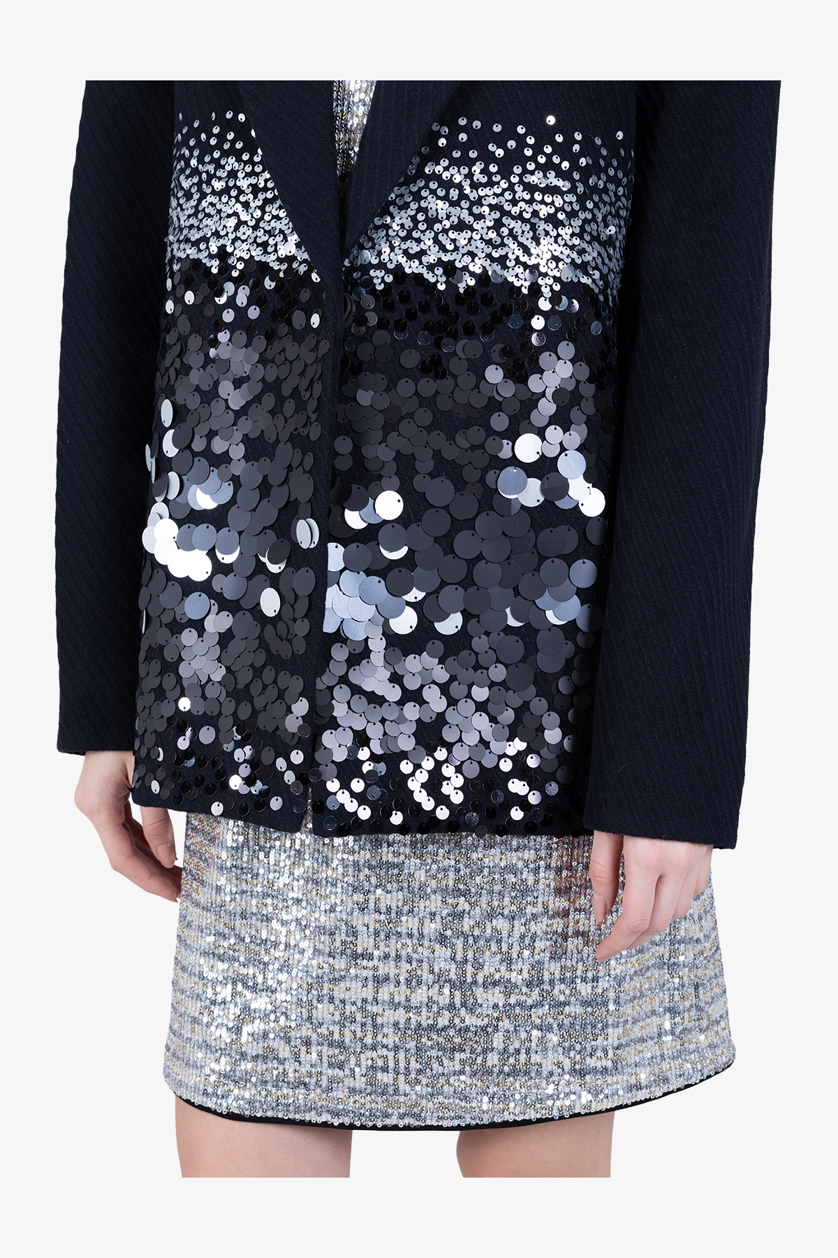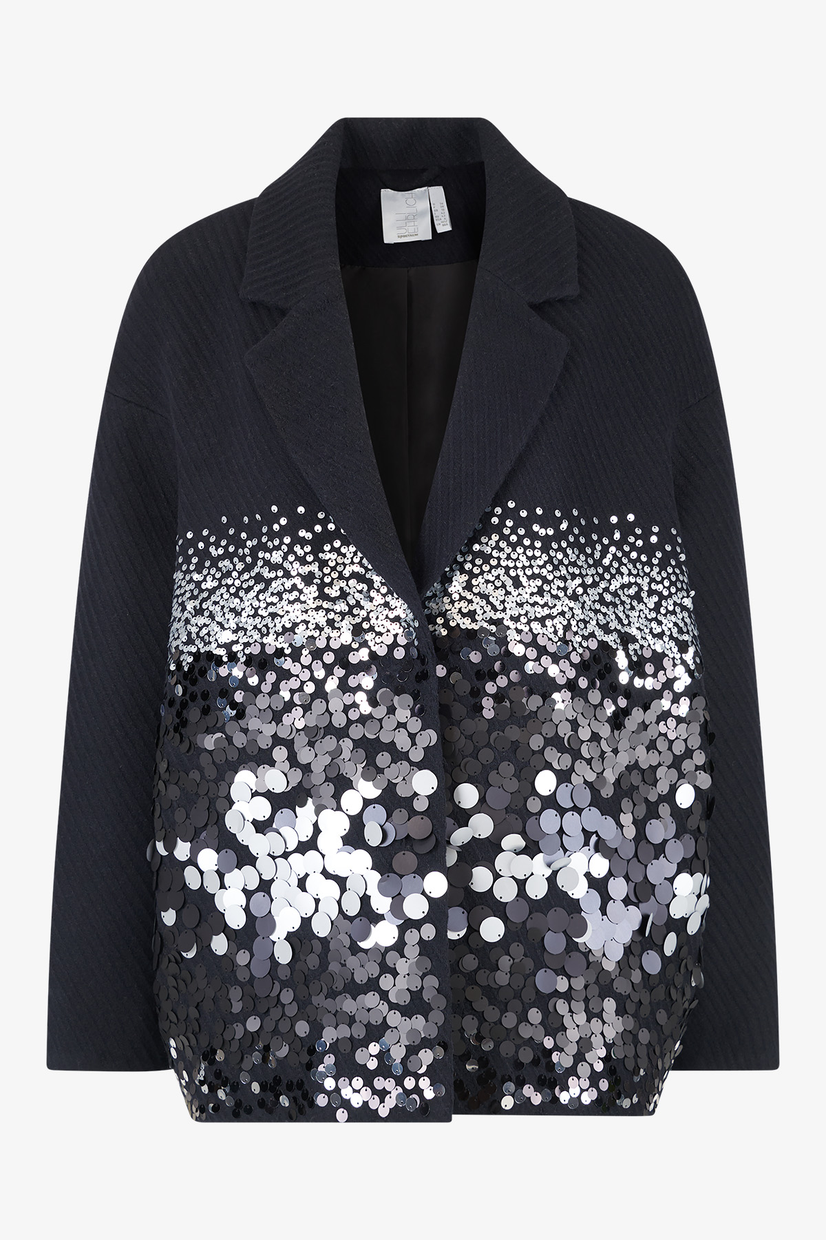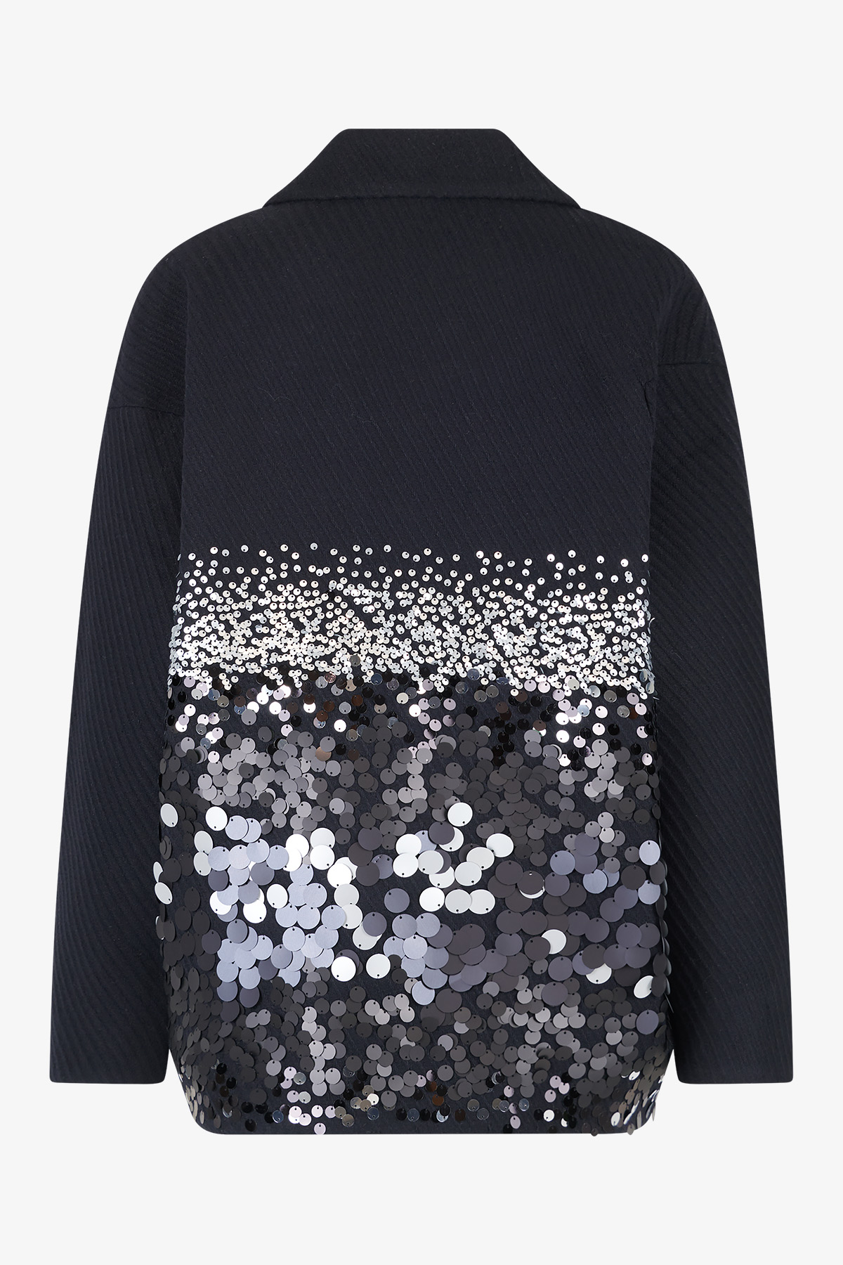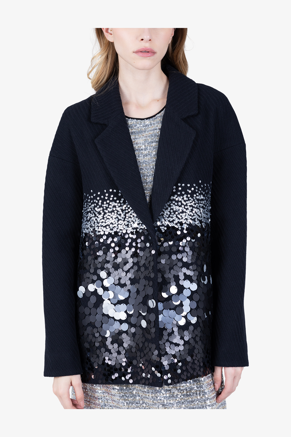 Модное пальто оверсайз с впечатляющий сложной отделкой пайетками. Оно добавляет гламура любому образу и подчеркивает стильный внешний вид.
