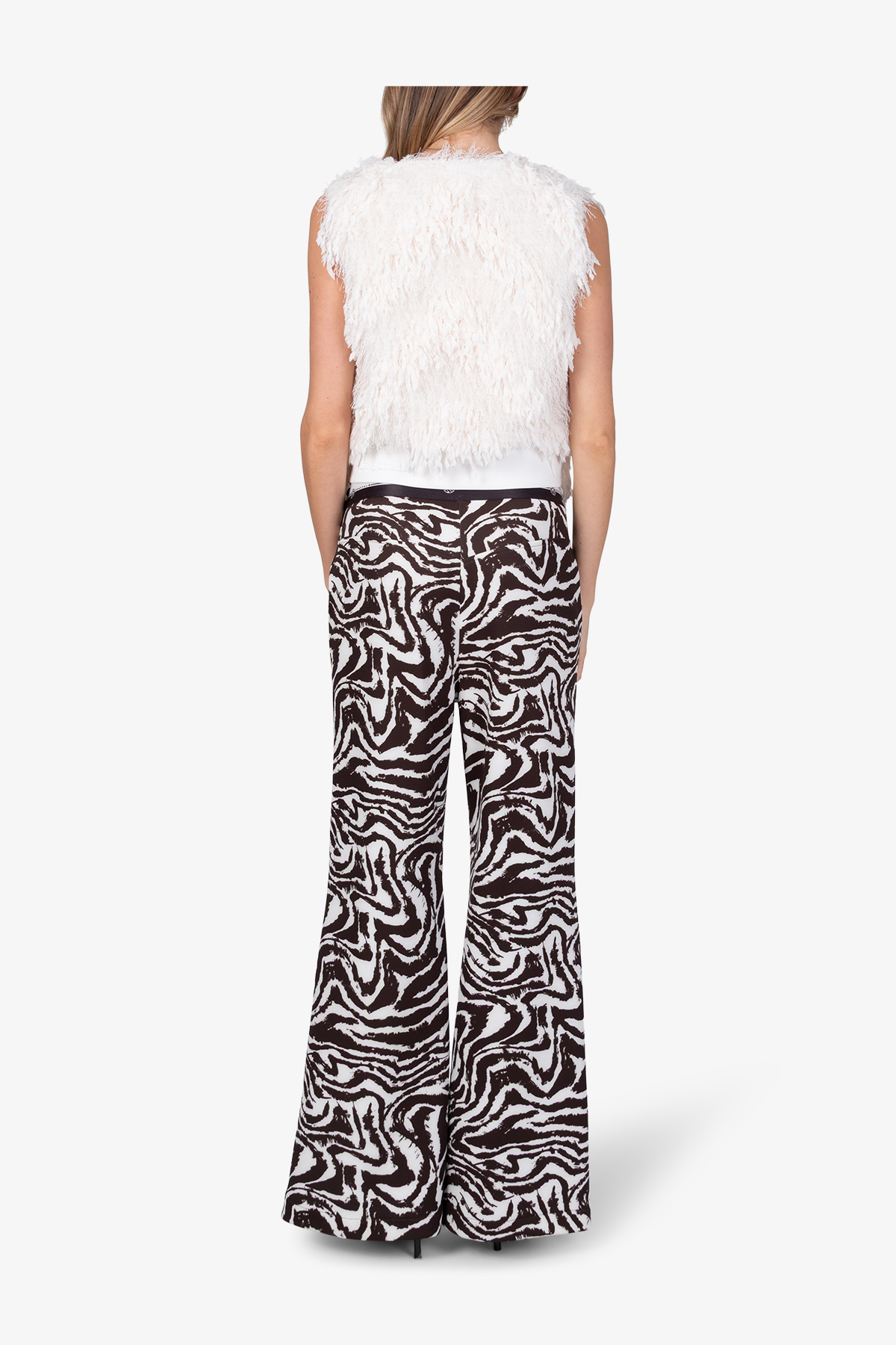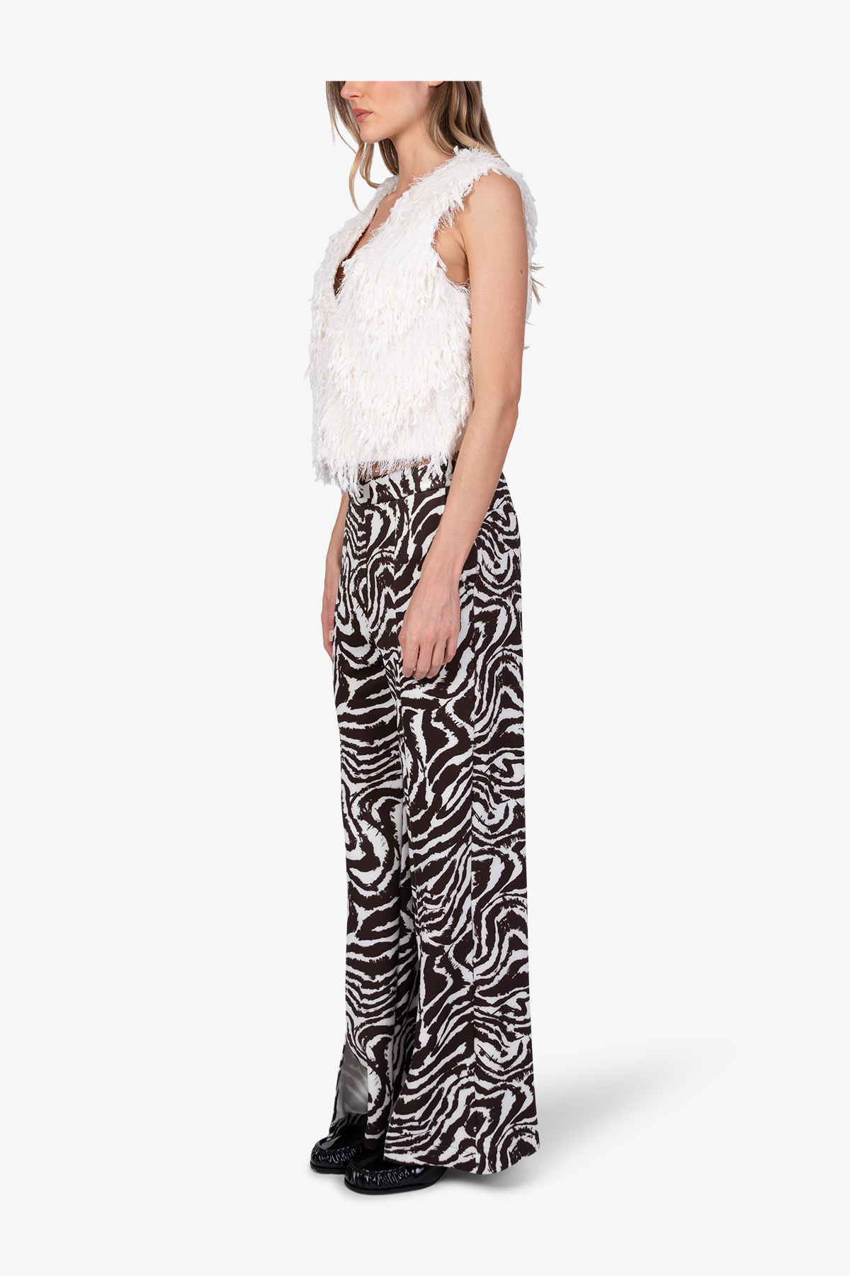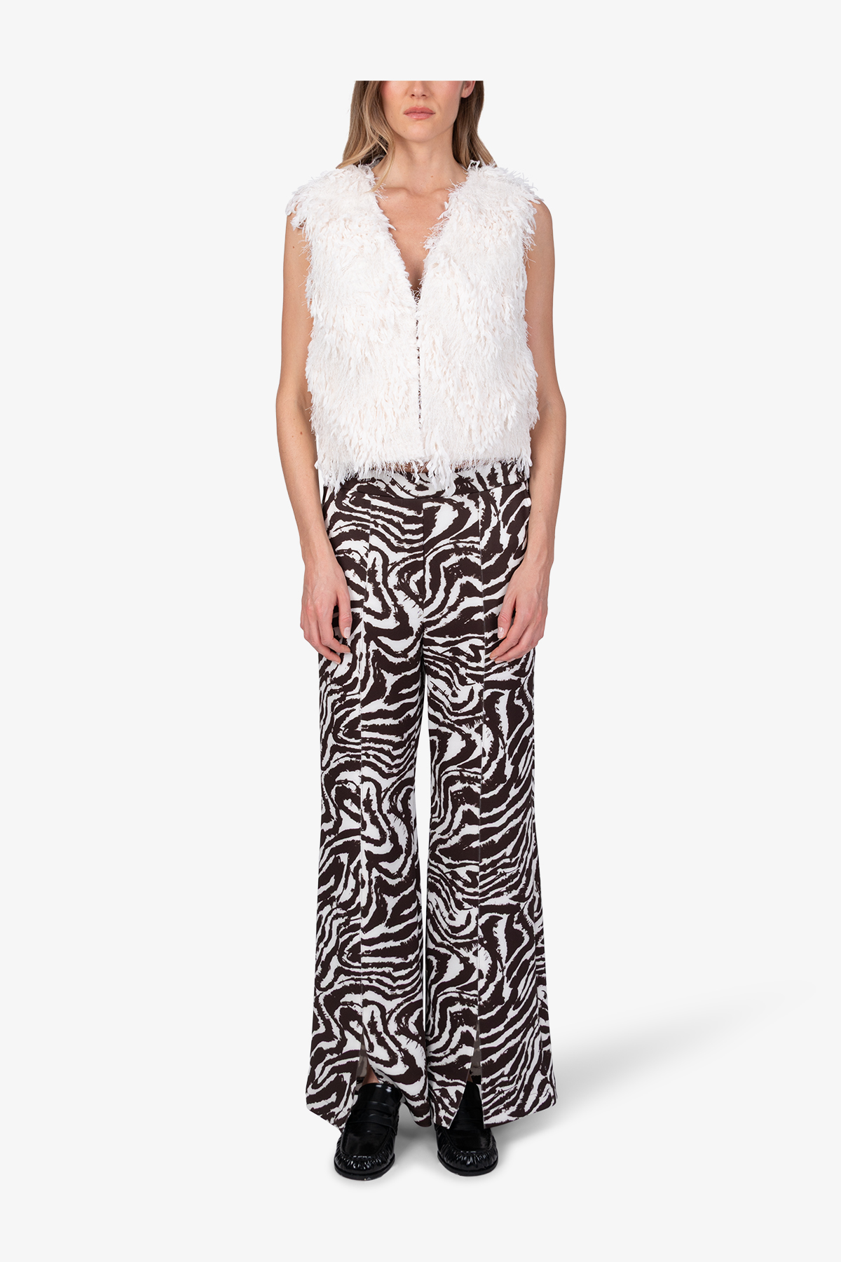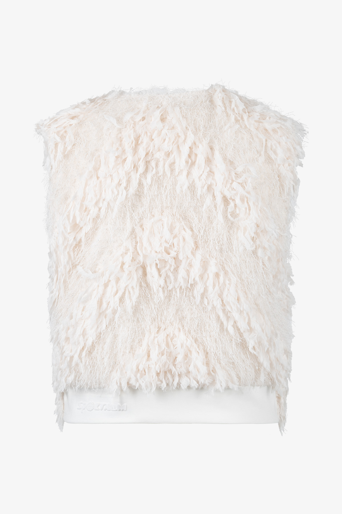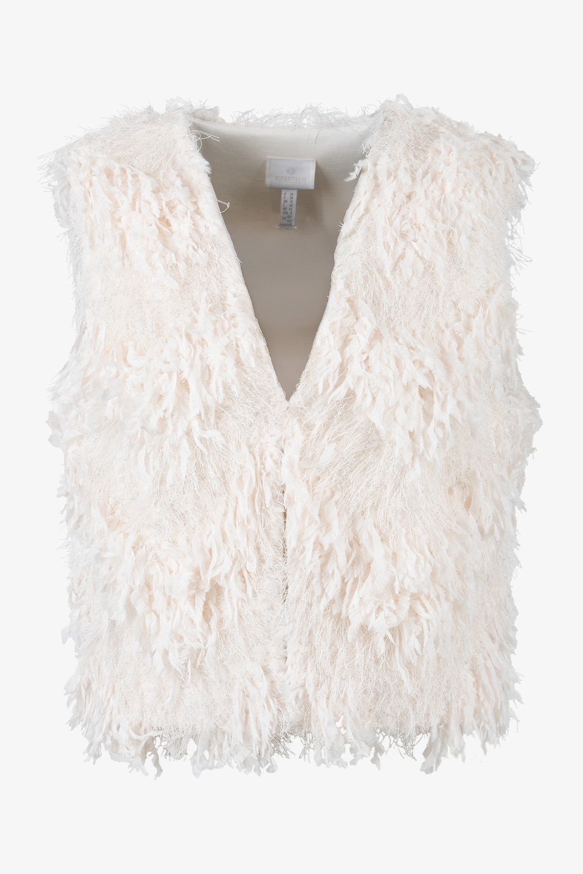 Жилет, в который нельзя не влюбиться. Он выполнен из экстравагантной ткани с бахромой и сочетает элегантность и оригинальность.