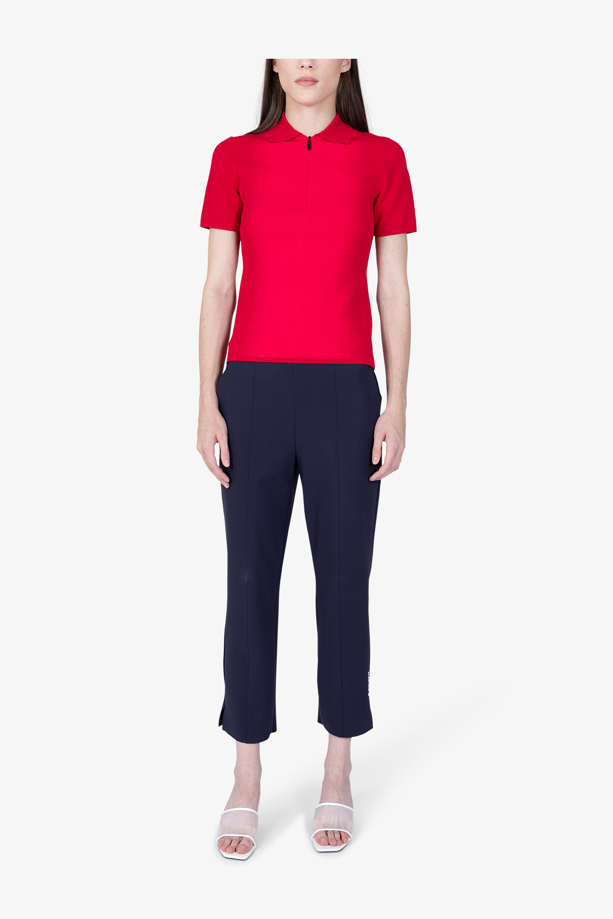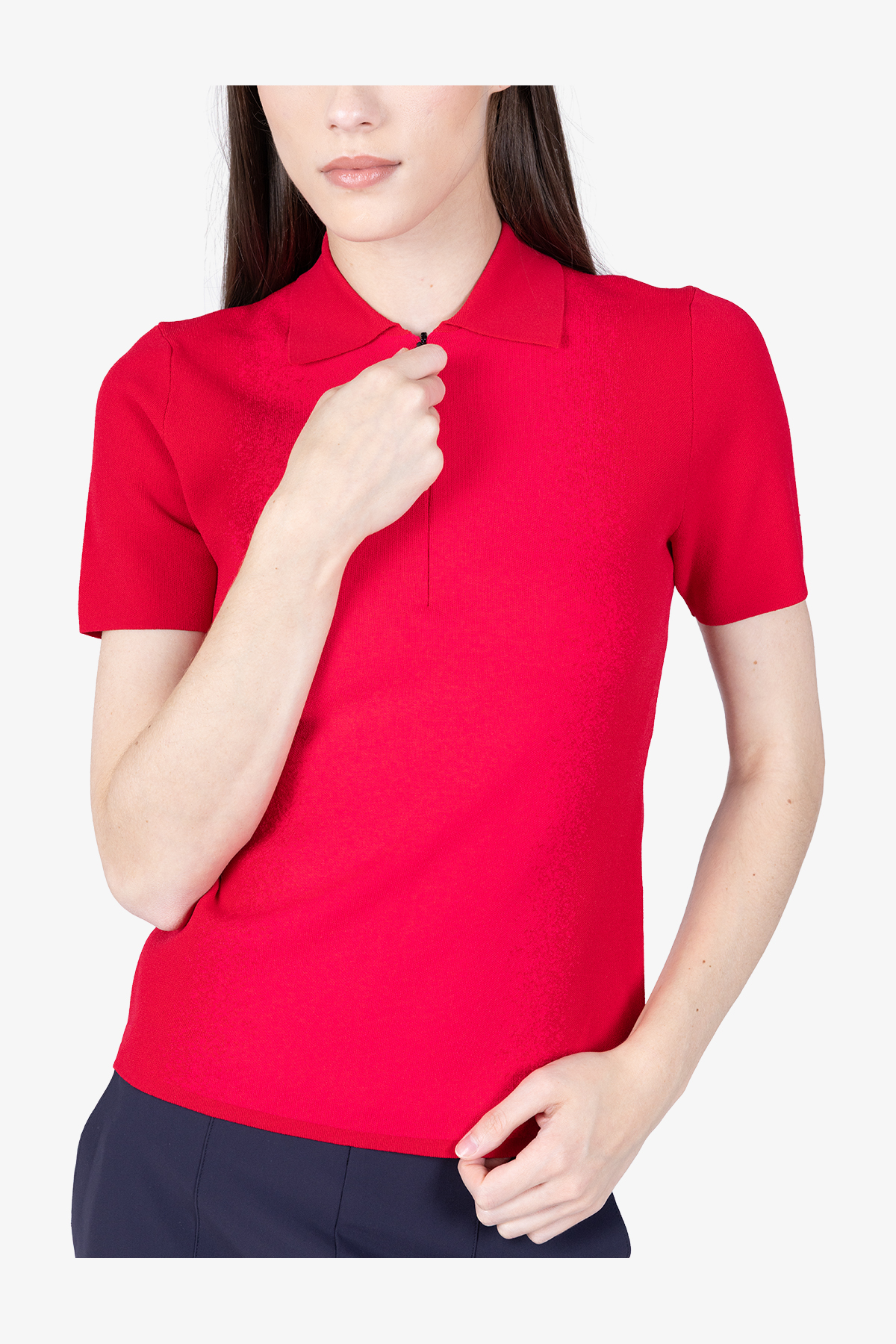 - Горловина: трикотажный воротник-поло, короткая скрытая молния спереди по центру