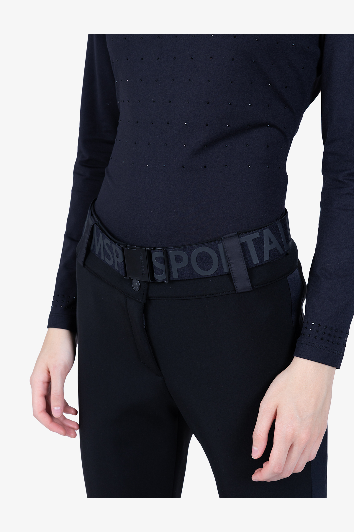 - Пояс: завышенная талия со скрытой молнией и двумя застежками-крючками спереди, шлевки и декоративный ремень