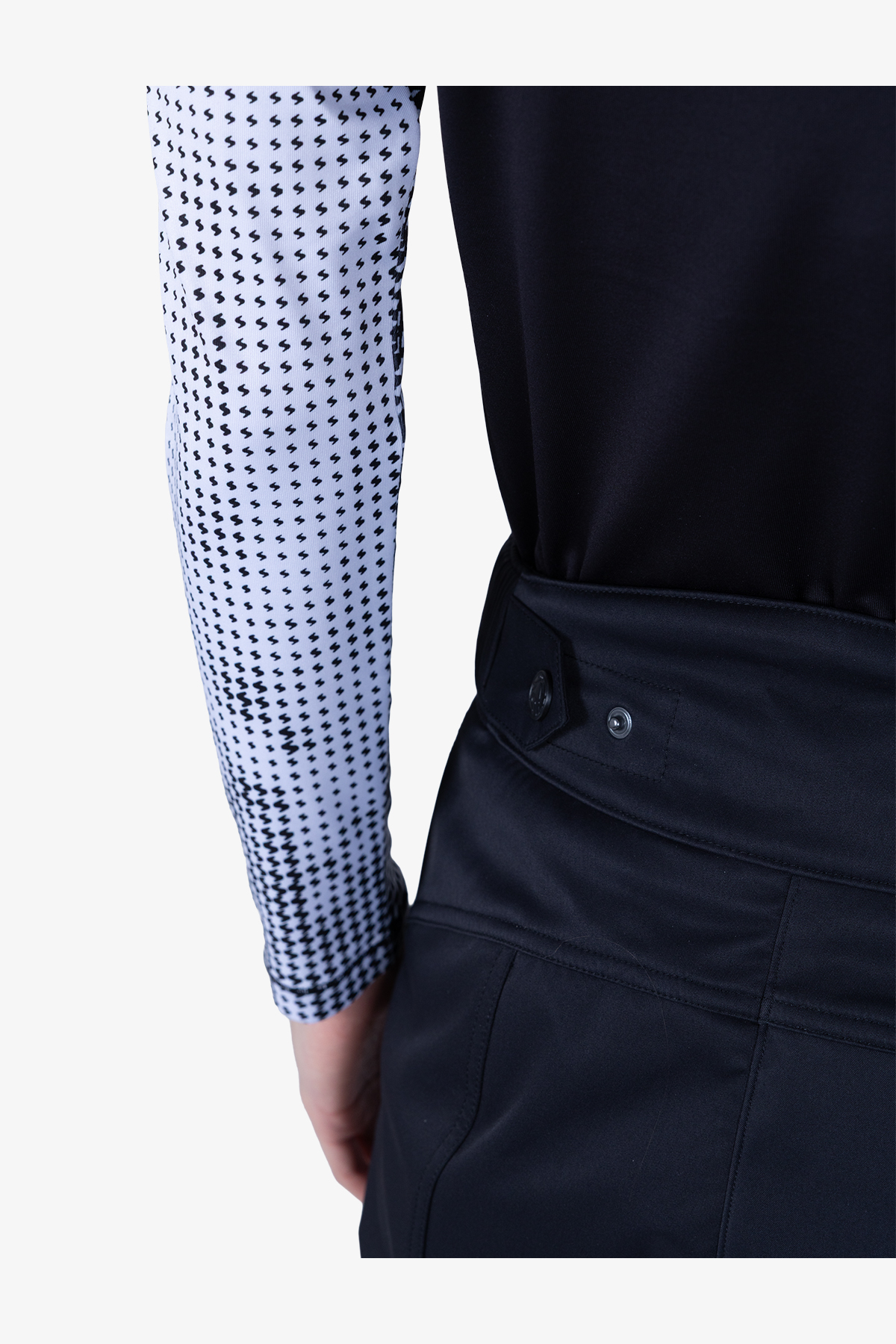 - Пояс: скрытая молния с кнопкой и застежкой-крючком спереди по центру, завышенная талия сзади, регулируемые хлястики с кнопками сзади для регулировки ширины