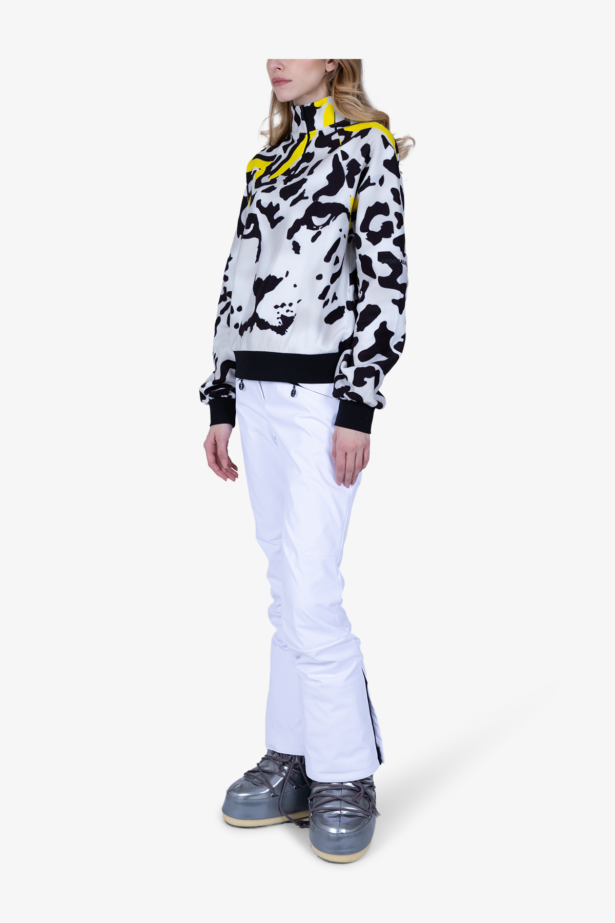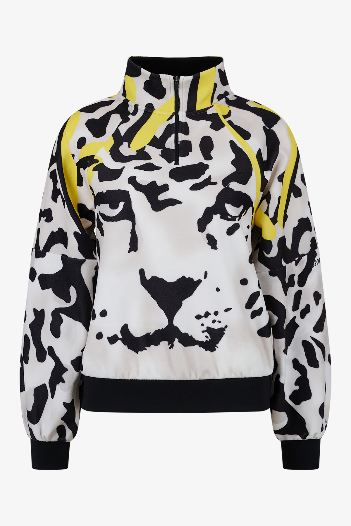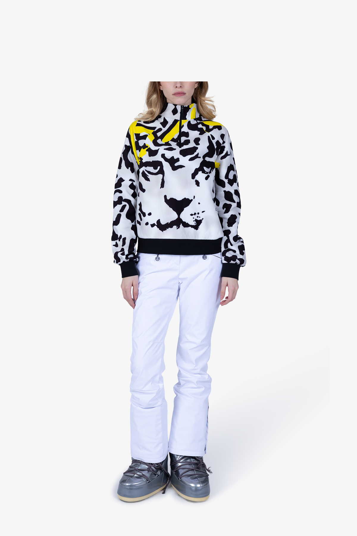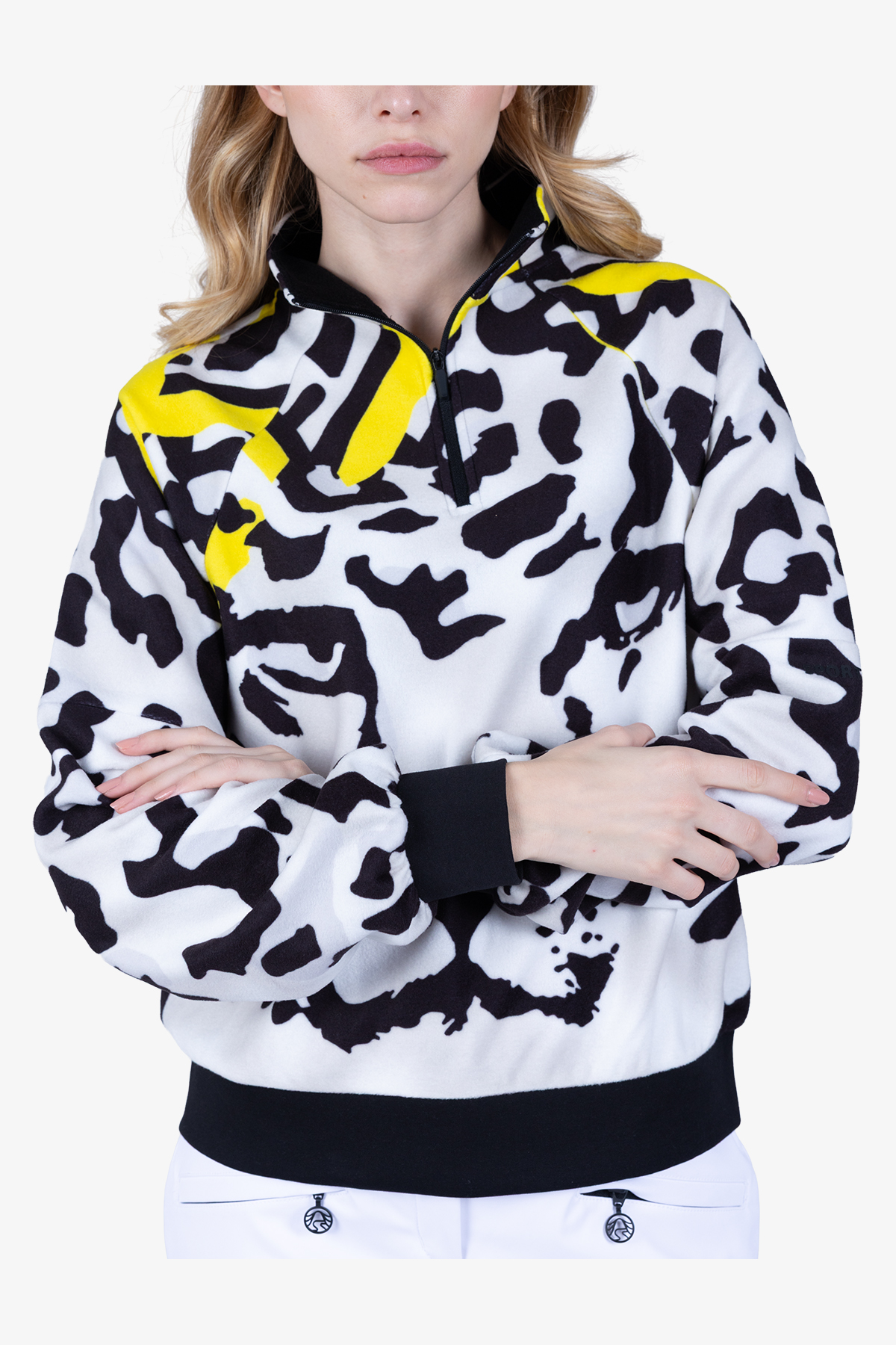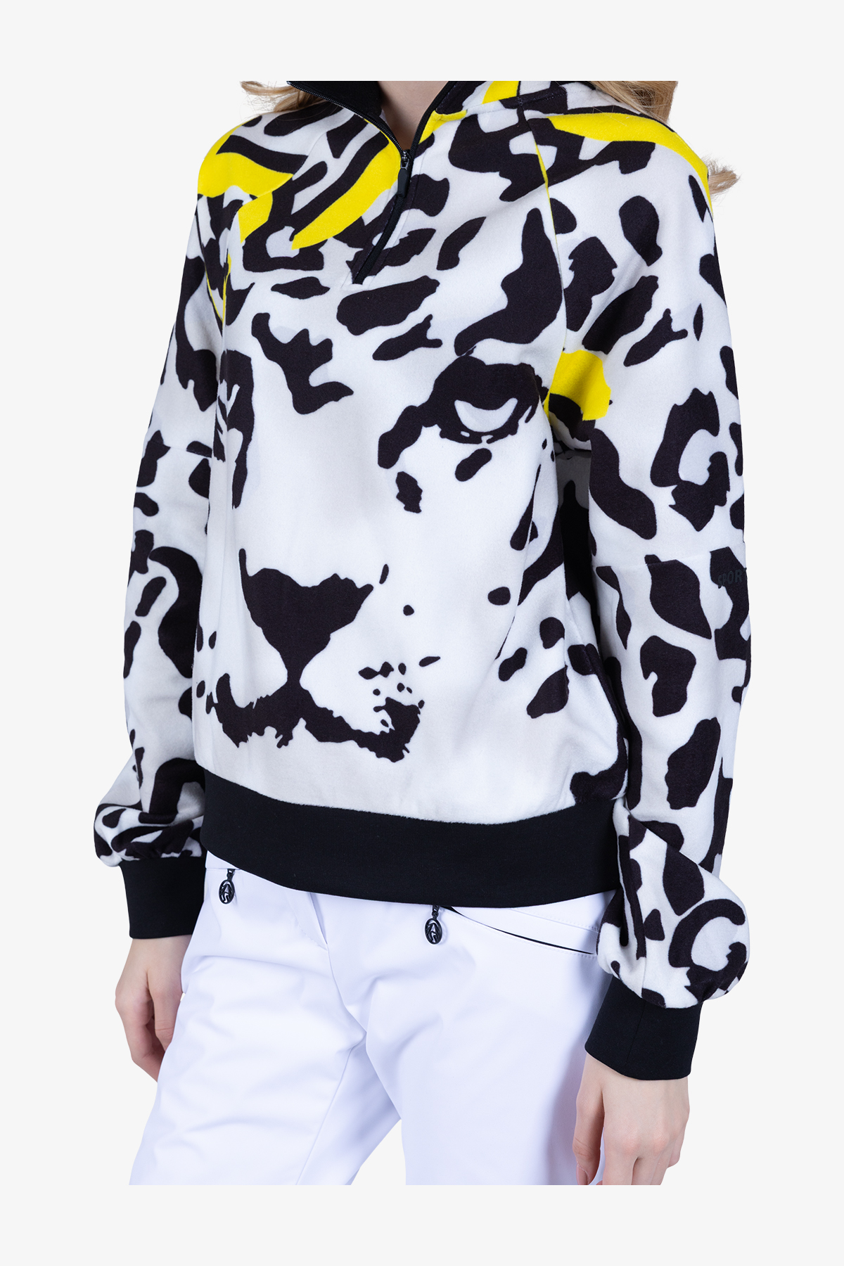 Флисовый свитер с экстравагантным анималистичным принтом по всей поверхности неизменно притягивает взгляды.